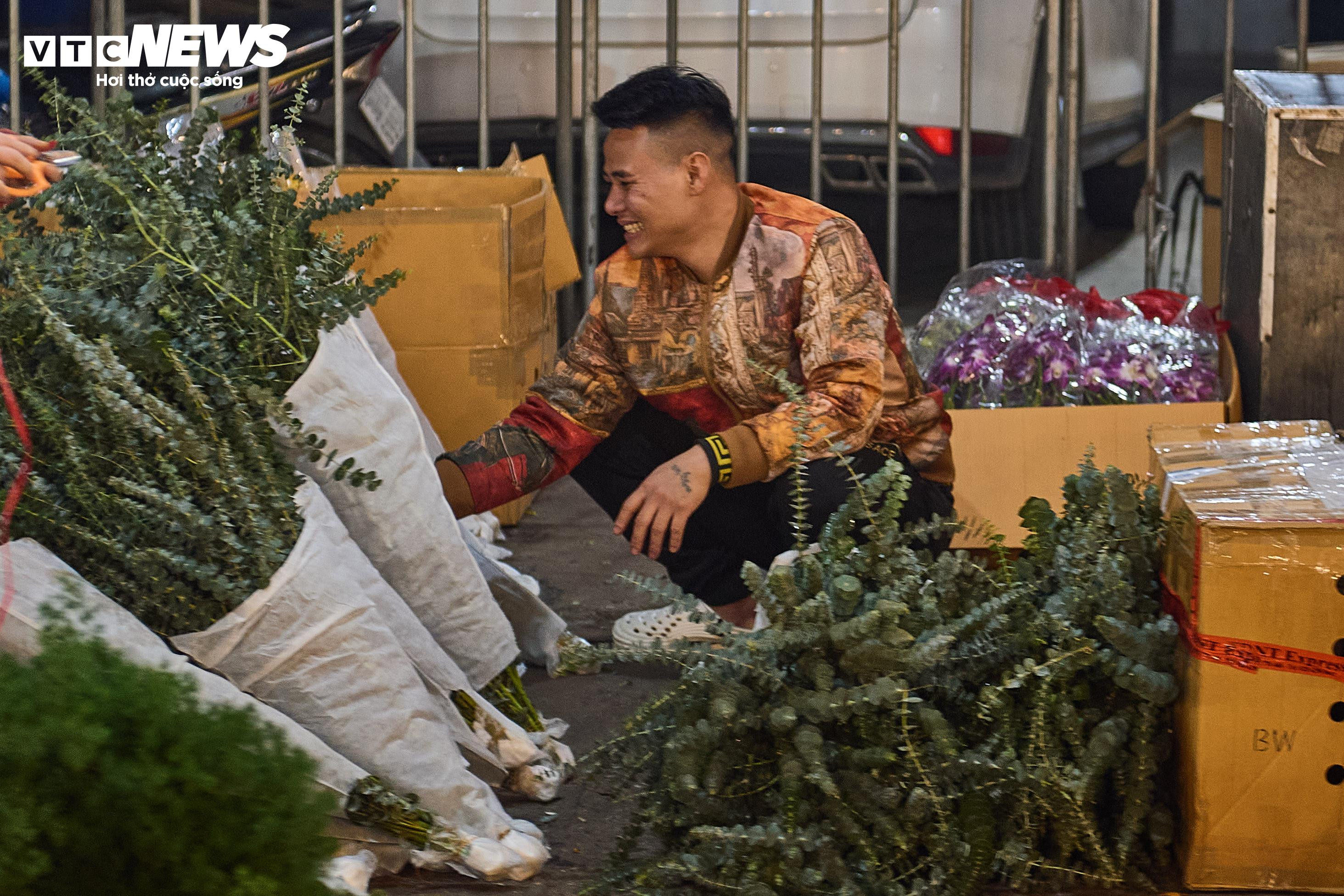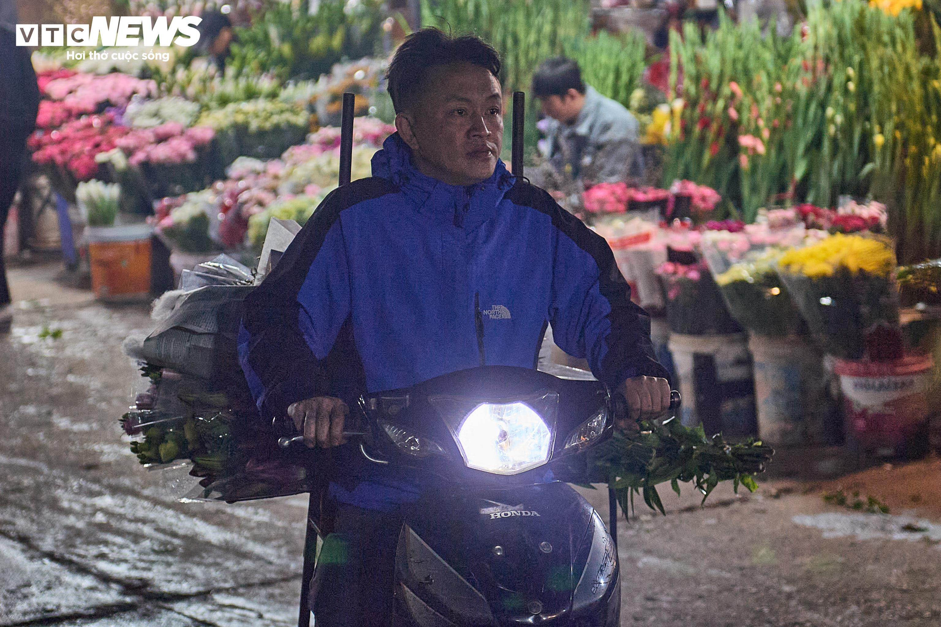 Tại chợ hoa Quảng Bá, các tiểu thương tất bật buộc hoa, chuyển hàng xuyên đêm để kịp phiên chợ sớm, bất chấp thời tiết rét đậm, rét hại.