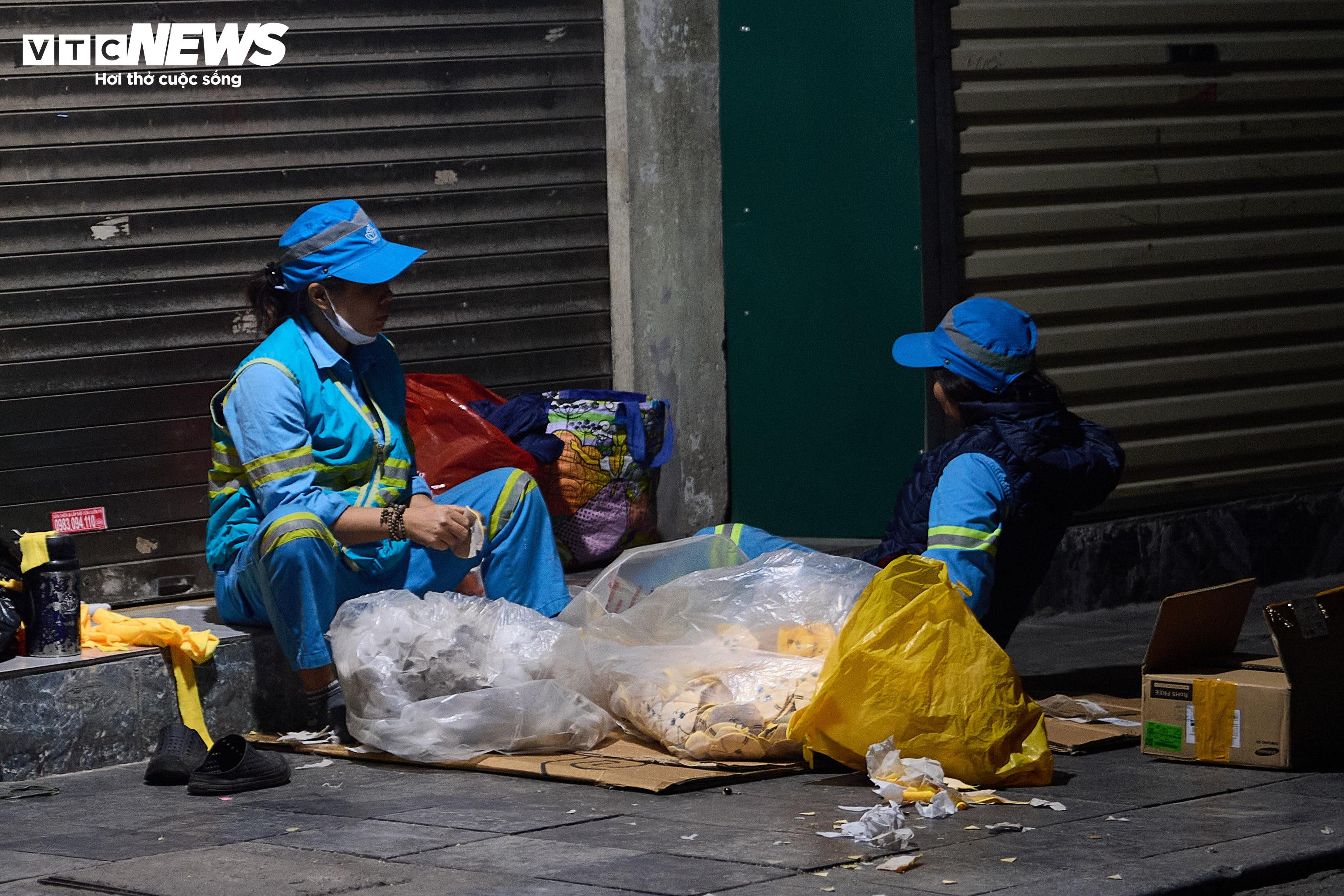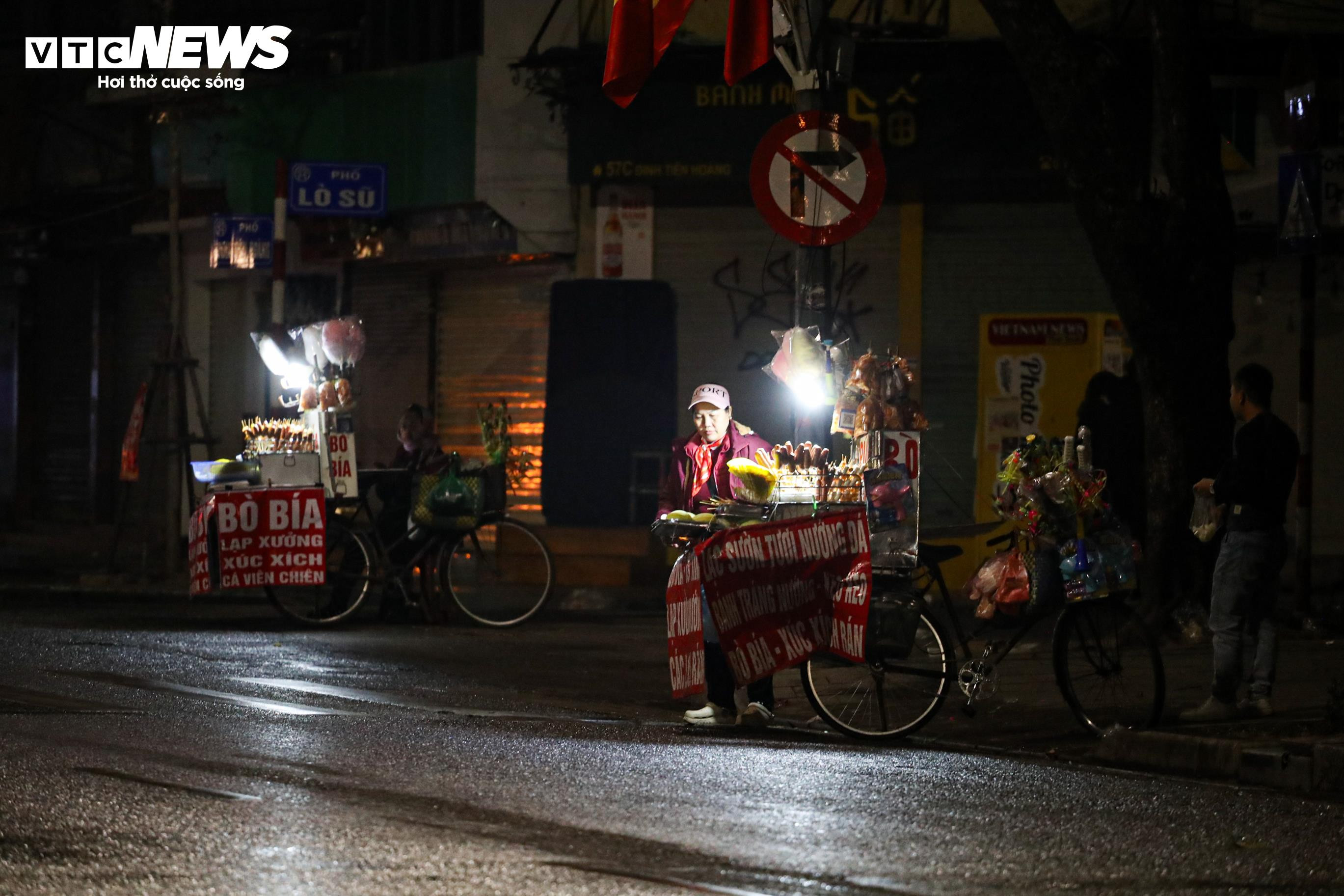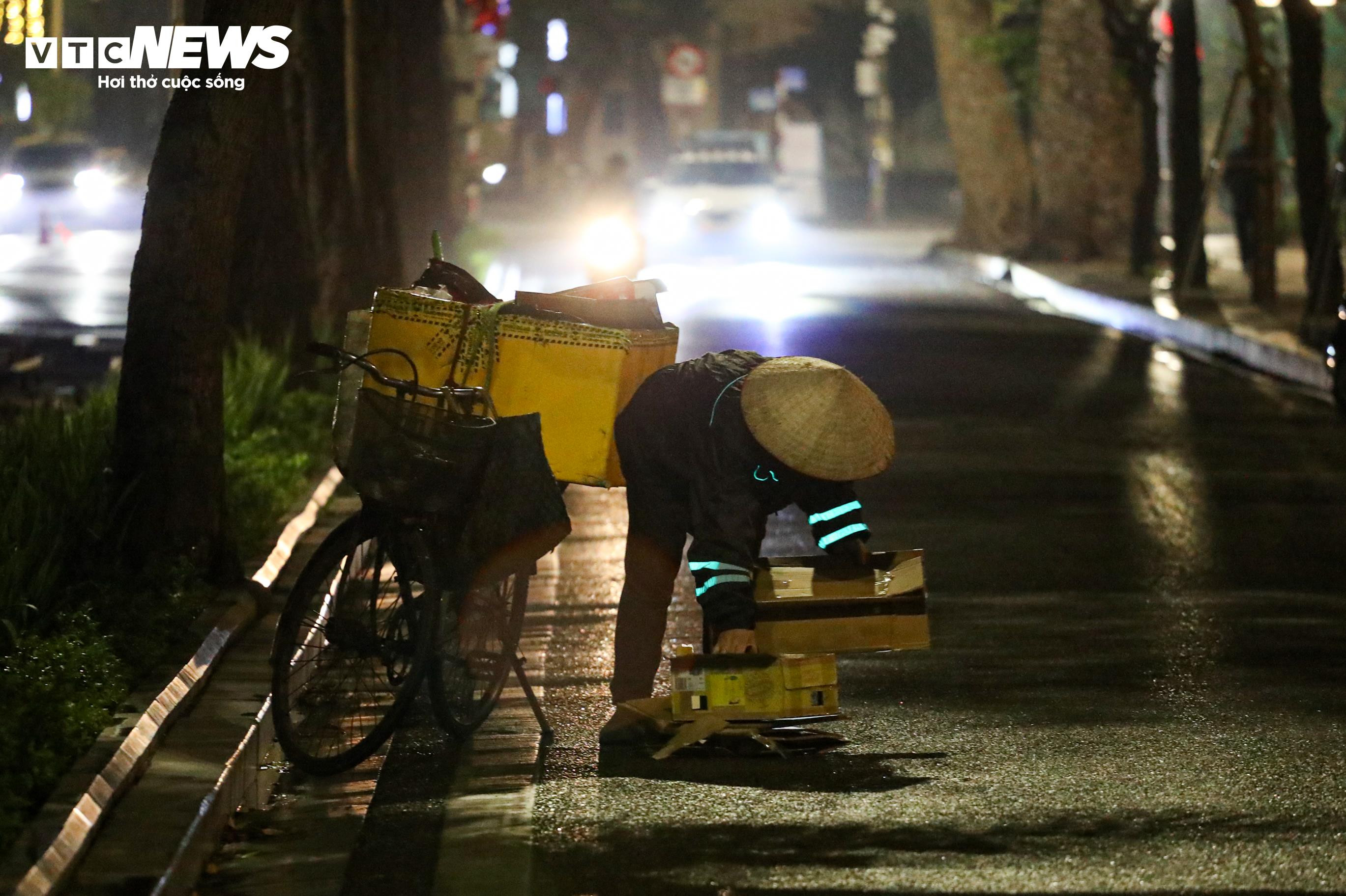 Đêm muộn, mưa lạnh kèm gió mạnh khiến nhiều hàng quán vắng khách, buộc phải thu dọn sớm. Một số người lao động kết thúc công việc sớm hơn thường lệ, tìm góc khuất gió để nghỉ tạm.