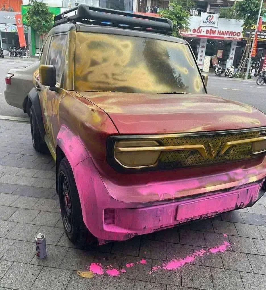 Chiếc xe bị xịt sơn loang lổ từ phía trước và cả hai bên xe. Chủ xe đã trích xuất camera và báo công an.