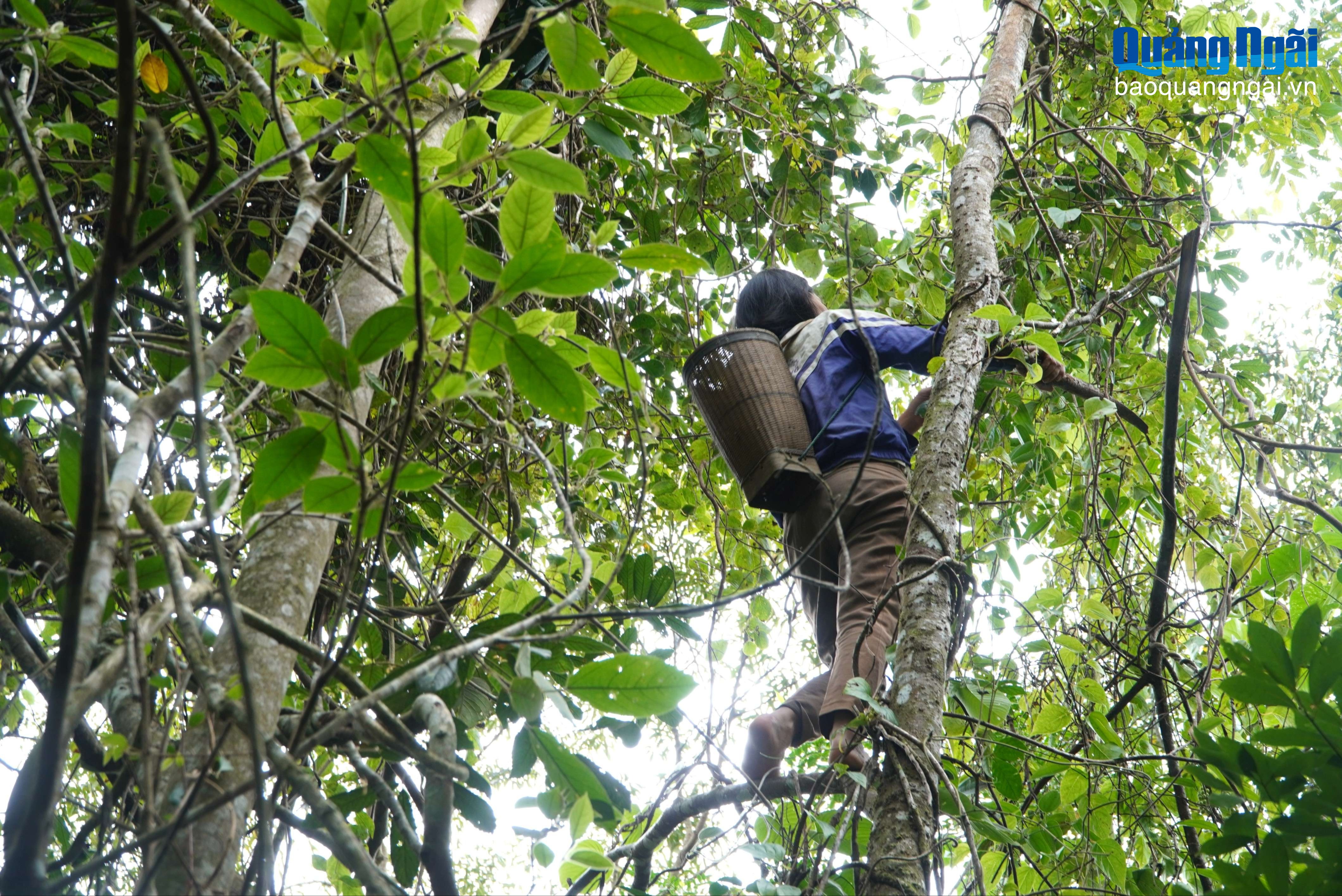 Còn những dây trên cao, người dân phải trèo lên cây thân gỗ để hái quả.