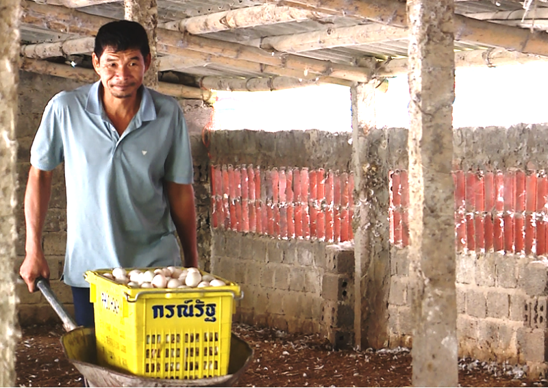 Trang trại nuôi vịt đẻ trứng của gia đình ông Nguyễn Viết Ngọc, xã Thọ Long được đầu tư xây dựng khép kín với quy mô hơn 2.000 con. Trung bình mỗi ngày ông Ngọc thu về khoảng 1.600 quả trứng. Ông Ngọc cho biết: “Với số lượng đàn vịt đẻ ăn từ 8- 9 bao cám mỗi ngày, giá gần 400 nghìn đồng/bao. Tổng chi phí thức ăn, điện nước, thuê nhân công thì 1 quả trứng phải hết 2.500 đồng. Tuy nhiên, từ sau Tết, giá trứng giảm dần, hiện tôi nhập cho các thương lái tại chỗ chỉ 2.200 đồng/quả, như vậy tôi đang lỗ khoảng 300 đồng 1 quả trứng".