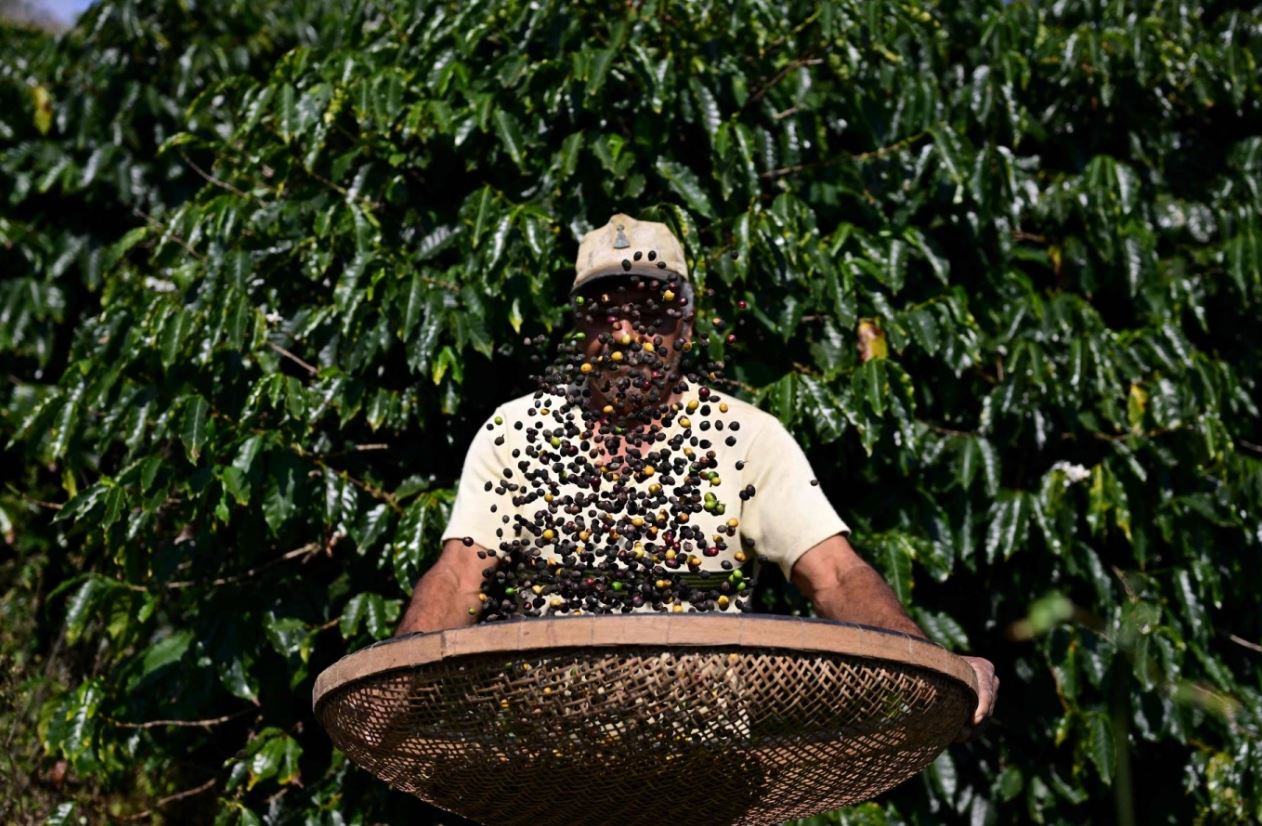 Nông dân thu hoạch cà phê ở bang Rio de Janeiro, Brazil. Ảnh: AFP