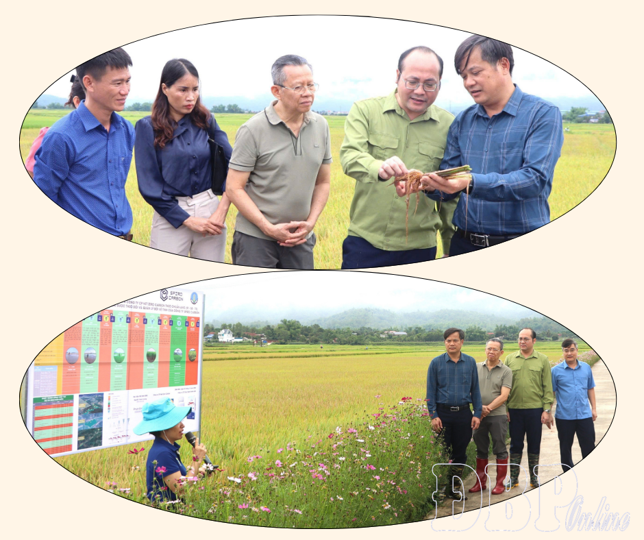 Các đồng chí lãnh đạo tỉnh cùng các chuyên gia kiểm tra, đánh giá mô hình canh tác lúa thông minh giảm phát thải khí nhà kính trên cánh đồng Mường Thanh.