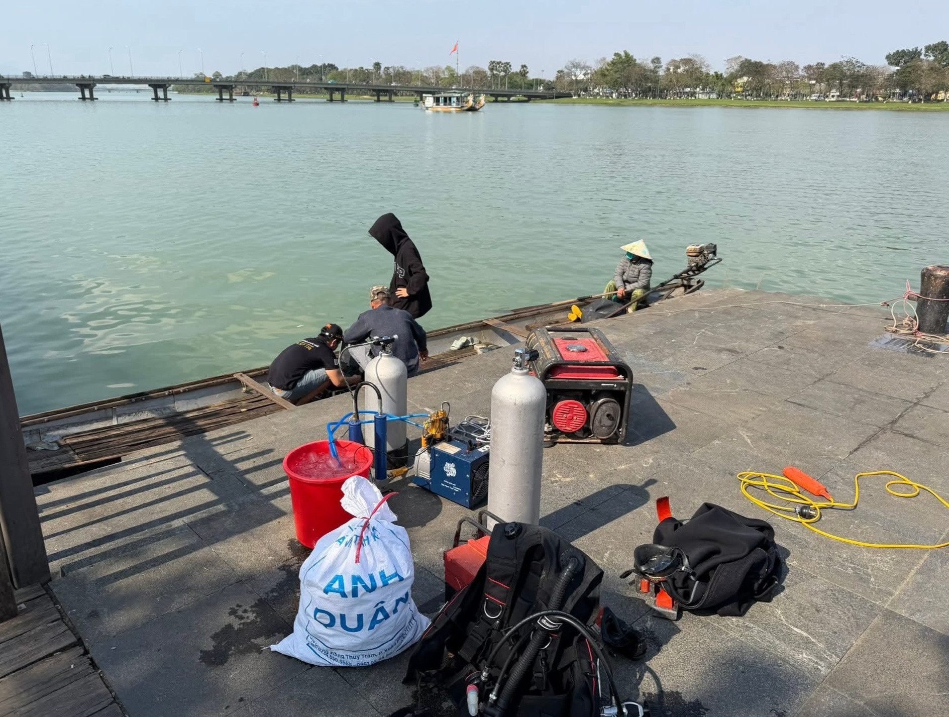 Trước đó lực lượng thuộc Đội SOS75 - Đội 0 đồng Huế sử dụng nhiều thiết bị, ngụp lặn nhiều giờ dưới sông Hương giúp người dân tìm lại số vàng đánh rơi. (Ảnh: Nhật Hoàng)