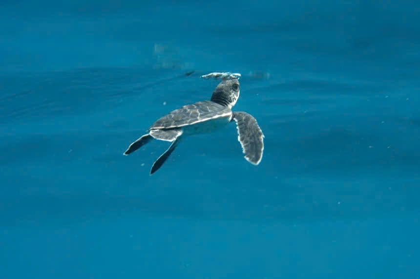 Một chú rùa biển xanh con bơi lên mặt nước. Ảnh: Nicolas J Pilcher.