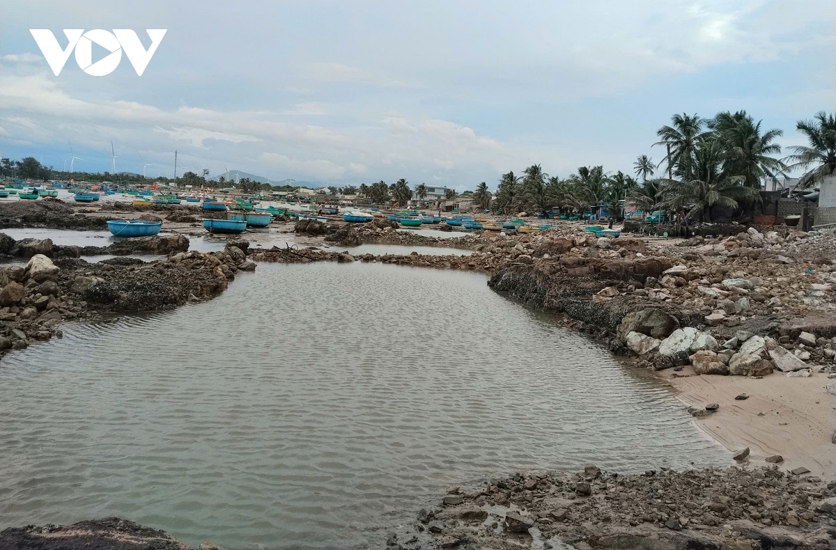 Còn phía bãi biển, những con mương sâu trên 3m, rộng hơn 5m, dài trên 20m, trước khu dân cư làng chài thôn 3 Bình Thạnh được đào sẵn để chờ thi công, không được rào chắn hay căng dây đặt biển báo, rất nguy hiểm cho trẻ em và khách du lịch.