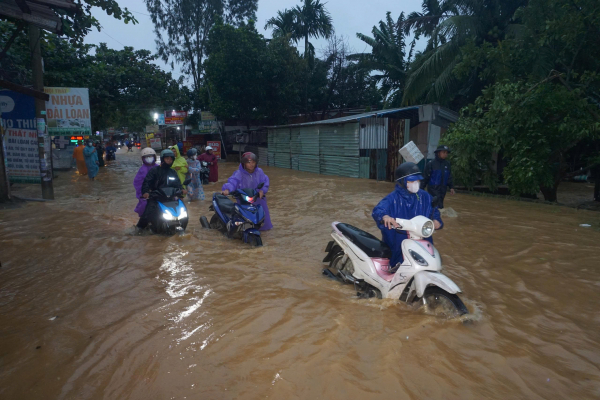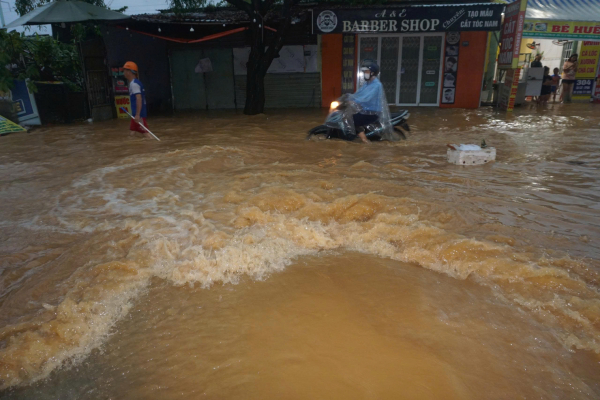 Nhiều tuyến đường khu vực Khu công nghiệp Hòa Khánh và phường Liên Chiểu (Đà Nẵng) bị ngập nặng, nước từ khu vực núi đổ xuống cuồn cuộn, tạo thành dòng chảy xiết tràn qua khu dân cư.