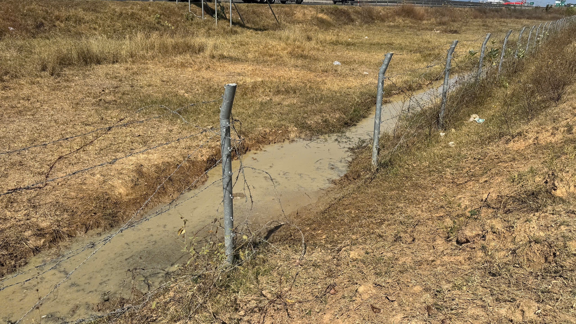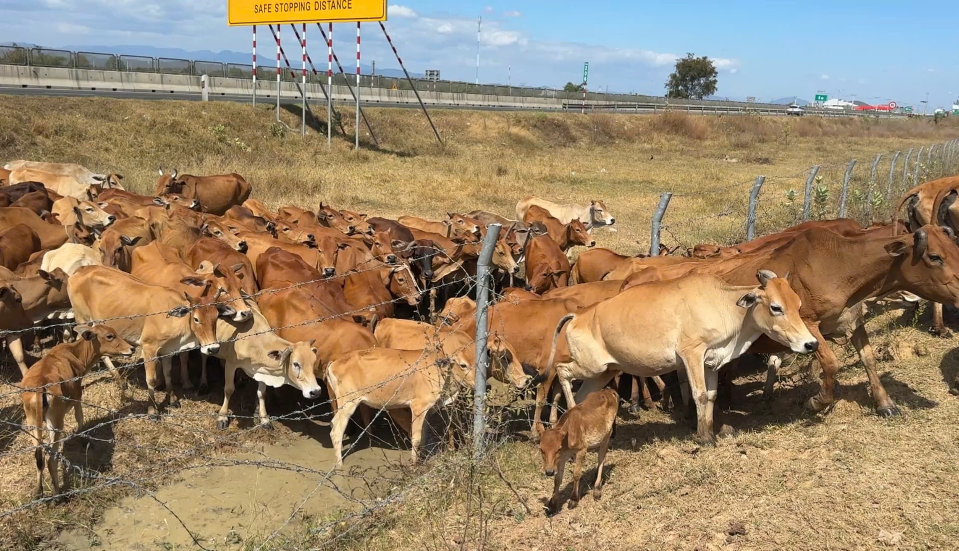 Một số đoạn của hàng rào kẽm gai bảo vệ cao tốc đã bị cắt tạo lối đi cho bò qua lại