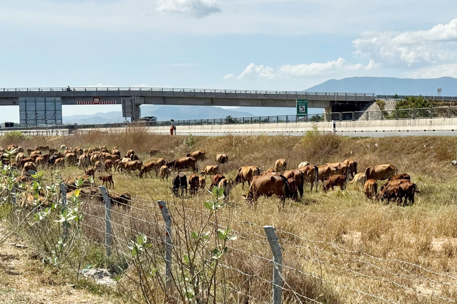 Những ngày cuối tháng 1/2026, tại Km206 tuyến cao tốc Vĩnh Hảo - Phan Thiết, đoạn qua xã Hàm Thuận Bắc, tỉnh Lâm Đồng, không khó để bắt gặp cảnh một đàn bò khoảng 100 con do hai người dân chăn dắt. Đàn bỏ thản nhiên gặm cỏ sát mép đường cao tốc. Tại đây, một số đoạn của hàng rào kẽm gai bảo vệ cao tốc đã bị cắt tạo lối đi cho bò qua lại.