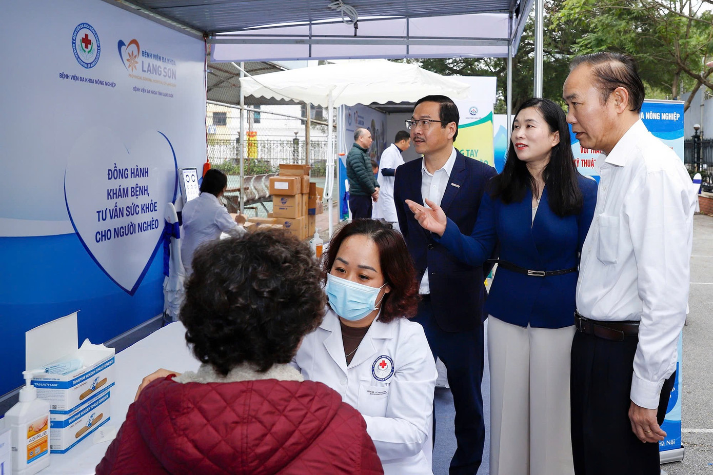 Thứ trưởng Phùng Đức Tiến, Phó Chủ tịch UBND tỉnh Lạng Sơn Trần Thanh Nhàn cùng Tổng Biên tập Báo Nông nghiệp và Môi trường Nguyễn Ngọc Thạch tham quan gian hàng khám chữa bệnh miễn phí cho người nghèo.