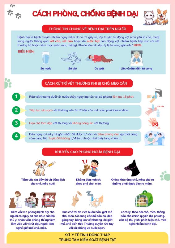 Để phòng bệnh dại, ngành Y tế tỉnh Đồng Tháp đưa ra các khuyến cáo phòng, chống bệnh dại đối với cộng đồng. Trong đó khuyến cáo hộ dân tiêm phòng đầy đủ cho chó, mèo nuôi và tiêm nhắc lại hằng năm theo khuyến cáo của ngành Thú y; không thả rông chó, mèo; chó ra đường phải được đeo rọ mõm; không đùa nghịch, trêu chọc chó, mèo.