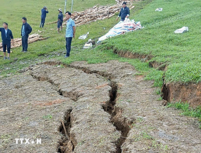 Các vết nứt xuất hiện tại phần thân đập chính của hồ thủy lợi Cay An với dung tích chứa khoảng 1,7 triệu m3 sau những trận mưa vừa qua. (Ảnh: TTXVN phát)
