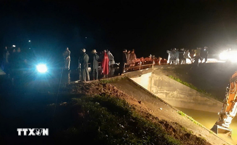 Hàng trăm người và phương tiện đang triển khai các biện pháp phòng chống vỡ đập tại hồ thủy lợi Cay An. (Ảnh: TTXVN phát)