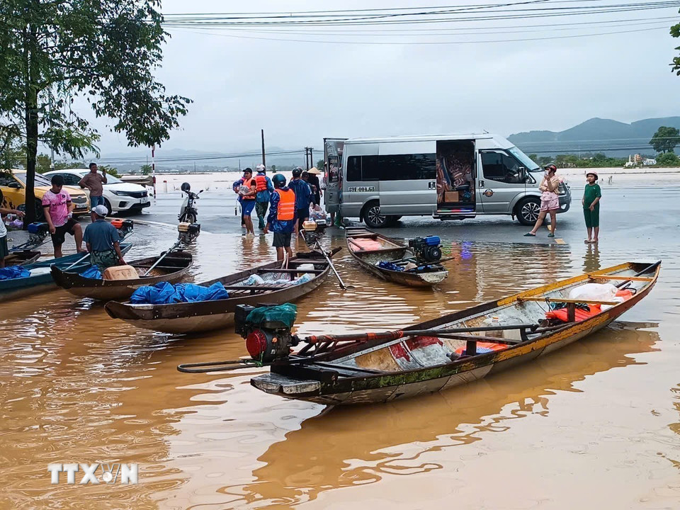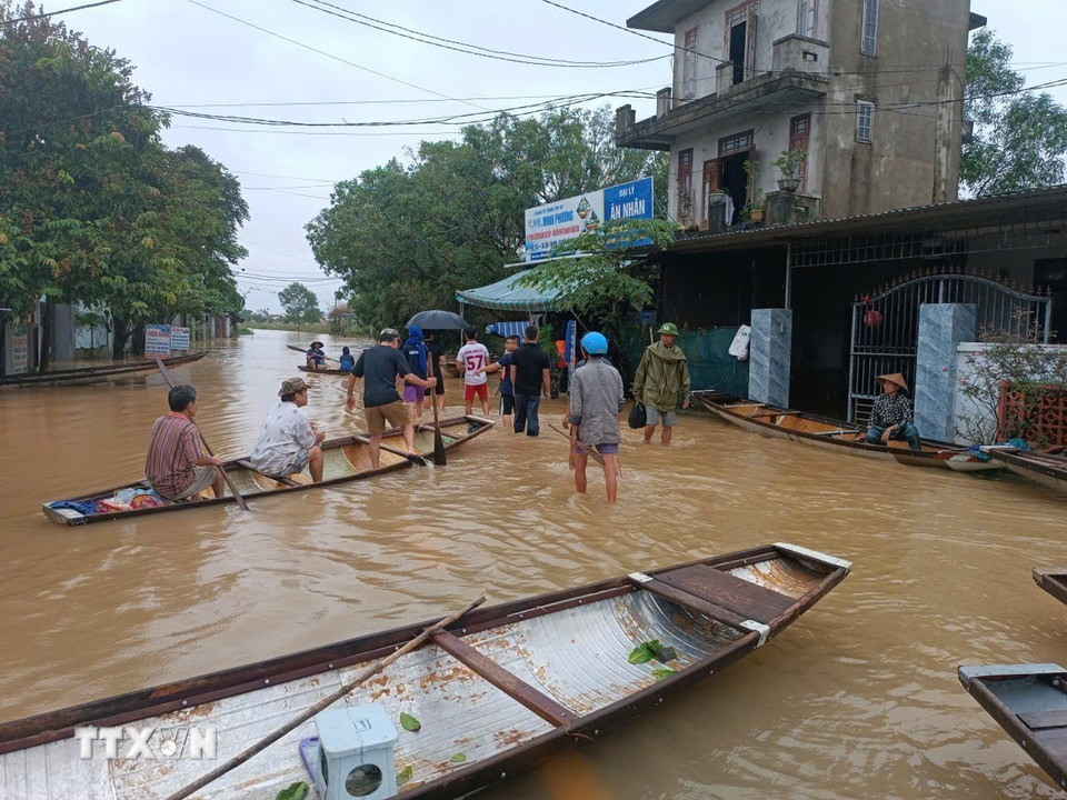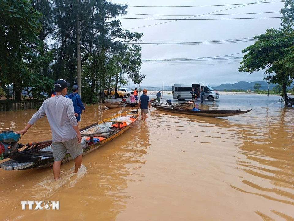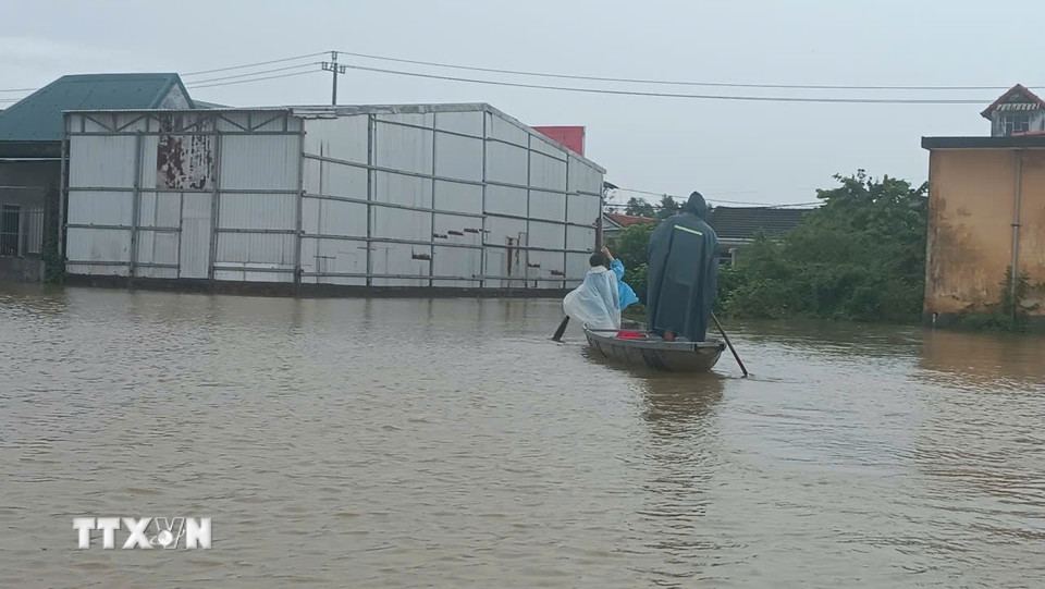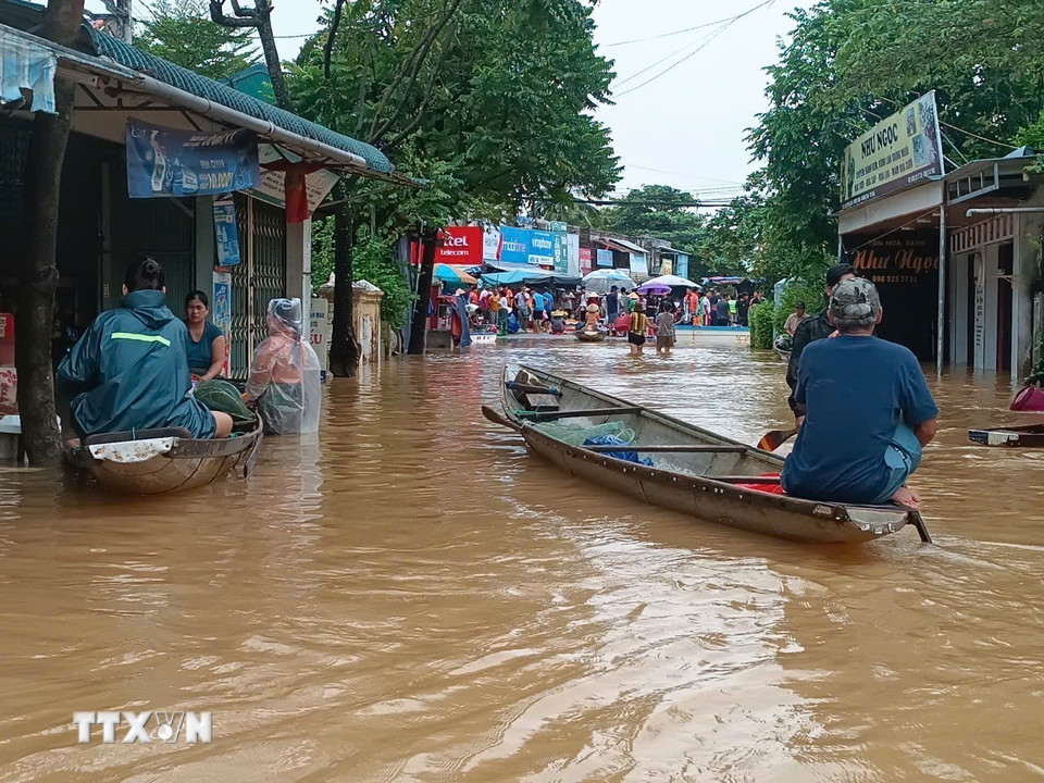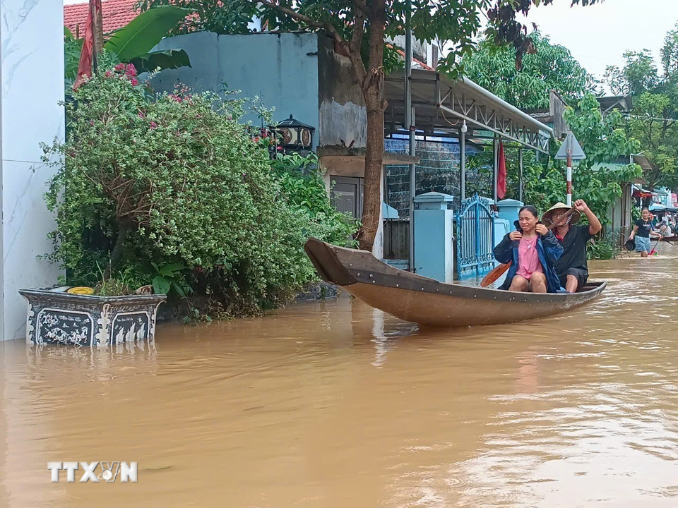 Nhiều người dân vùng lũ lụt chọn ghe, xuồng làm phương tiện đi lại trong mưa lũ. (Ảnh: Hải Âu/TTXVN)