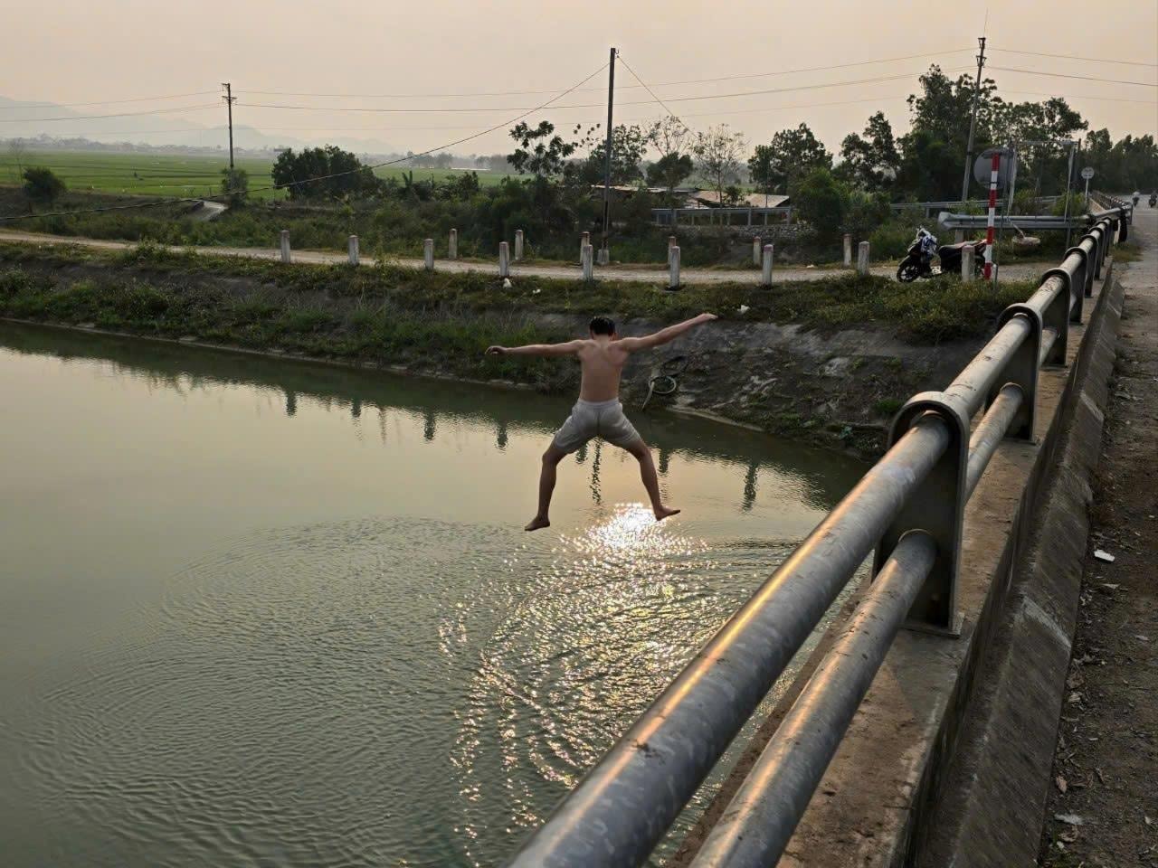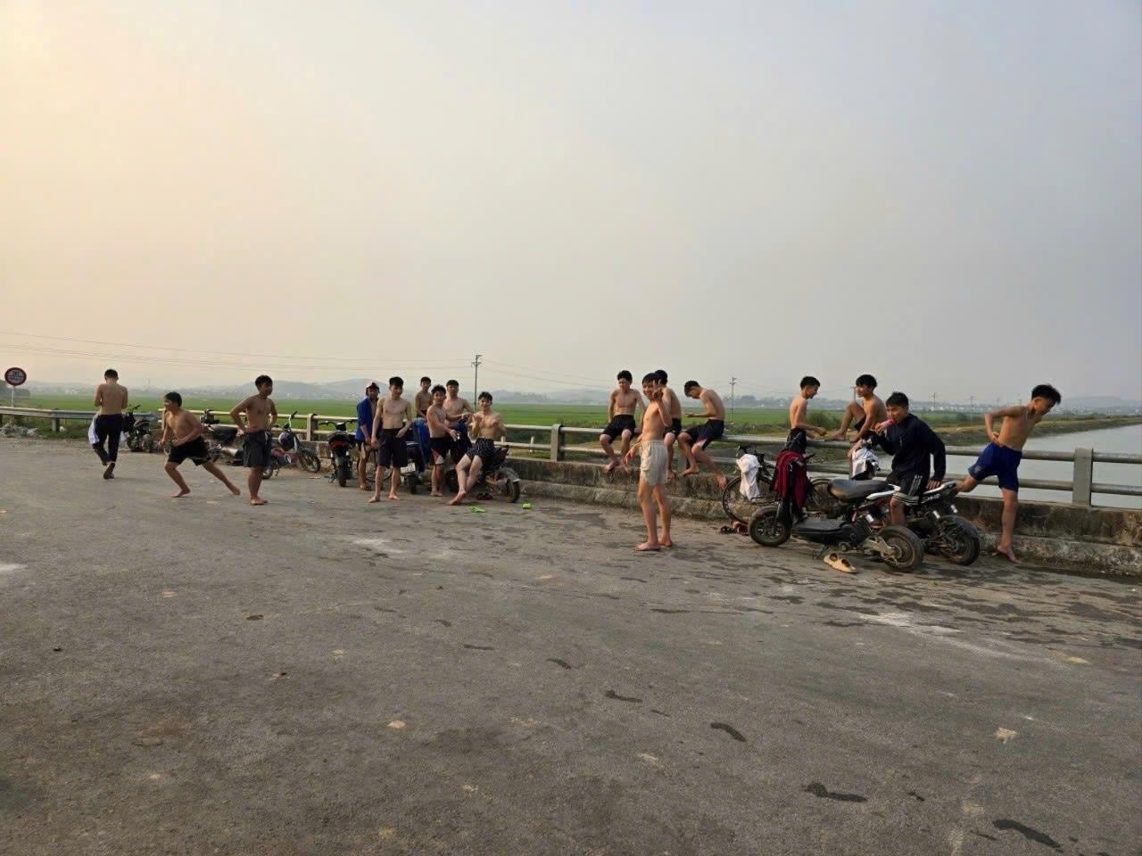 Trong khung giờ từ 16h30 đến 18h30 phút, nhiều em nhỏ mang theo xe đạp, xe máy điện dừng ngay trên cầu. Quần áo, giày dép để ngổn ngang, tiếng cười nói, hò reo vang cả một vùng. Không ít em trèo lên lan can, thậm chí đứng trên thành cầu rồi nhảy xuống dòng nước trong sự cổ vũ của bạn bè. Những hành động vô tư này nhưng lại tiềm ẩn nhiều rủi ro.