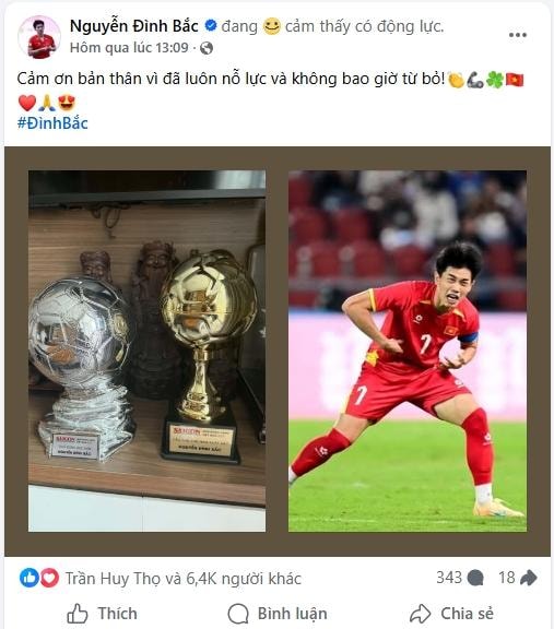 Thay vì tập trung vào sự tiếc nuối khi không thể chạm tay vào Quả bóng vàng, Đình Bắc chọn cách nhìn lại chặng đường tự thân vận động. Trên trang cá nhân, tiền đạo thuộc biên chế Công an Hà Nội viết ngắn gọn: “Cảm ơn bản thân vì đã luôn nỗ lực và không bao giờ từ bỏ!”. Câu nói đơn giản này nhanh chóng nhận được sự đồng cảm lớn từ giới chuyên môn và người hâm mộ.
