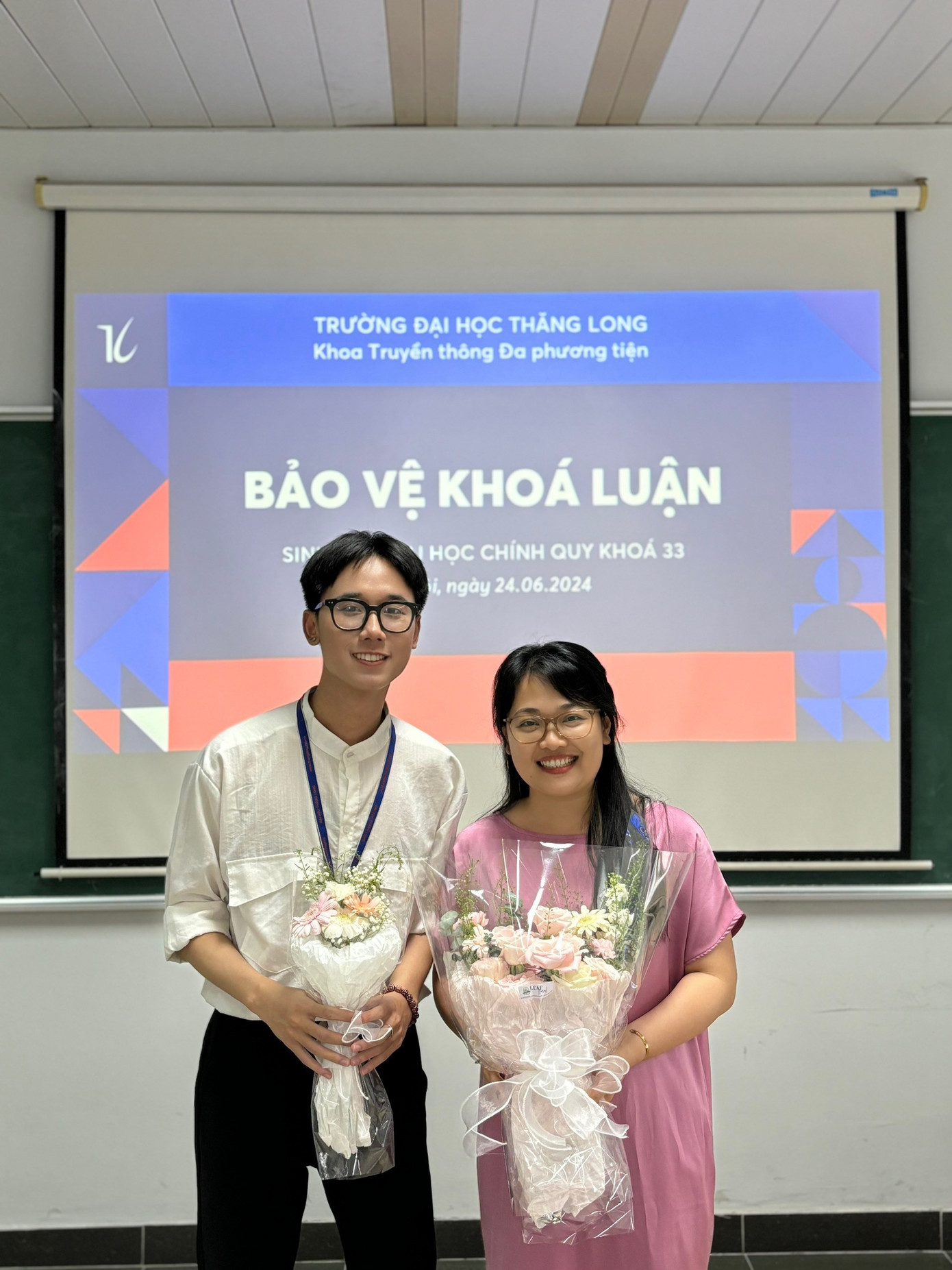 Đức Anh trong buổi bảo vệ cùng Thạc sĩ Trần Thị Thùy Dương.