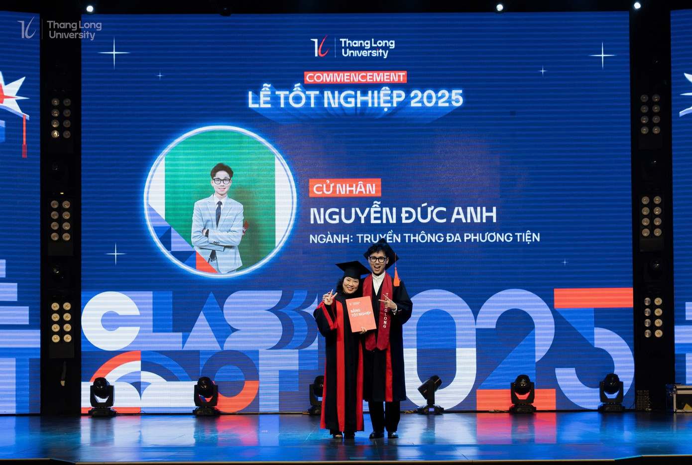Đức Anh trong ngày tốt nghiệp cùng Tiến sĩ Vũ Thị Thanh Nhàn, Trưởng khoa Truyền thông Đa phương tiện.
