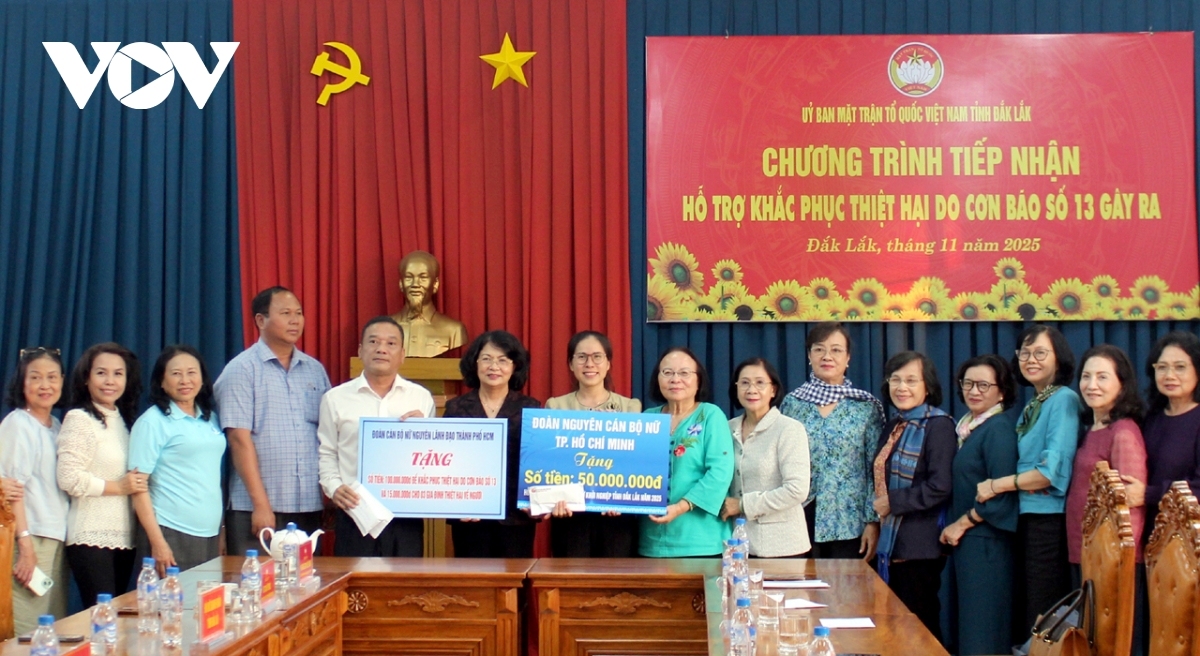 Tại buổi làm việc với Ủy ban Mặt trận Tổ quốc Việt Nam tỉnh Đắk Lắk chiều tối nay (14/11), bà Đặng Thị Ngọc Thịnh và đoàn công tác đã trao 100 triệu đồng hỗ trợ tỉnh khắc phục hậu quả bão số 13; trao 50 triệu đồng giúp Hội Liên hiệp Phụ nữ tỉnh triển khai chương trình “Phụ nữ khởi nghiệp” năm 2025; và trao 15 triệu đồng hỗ trợ các gia đình có người mất do bão lũ.