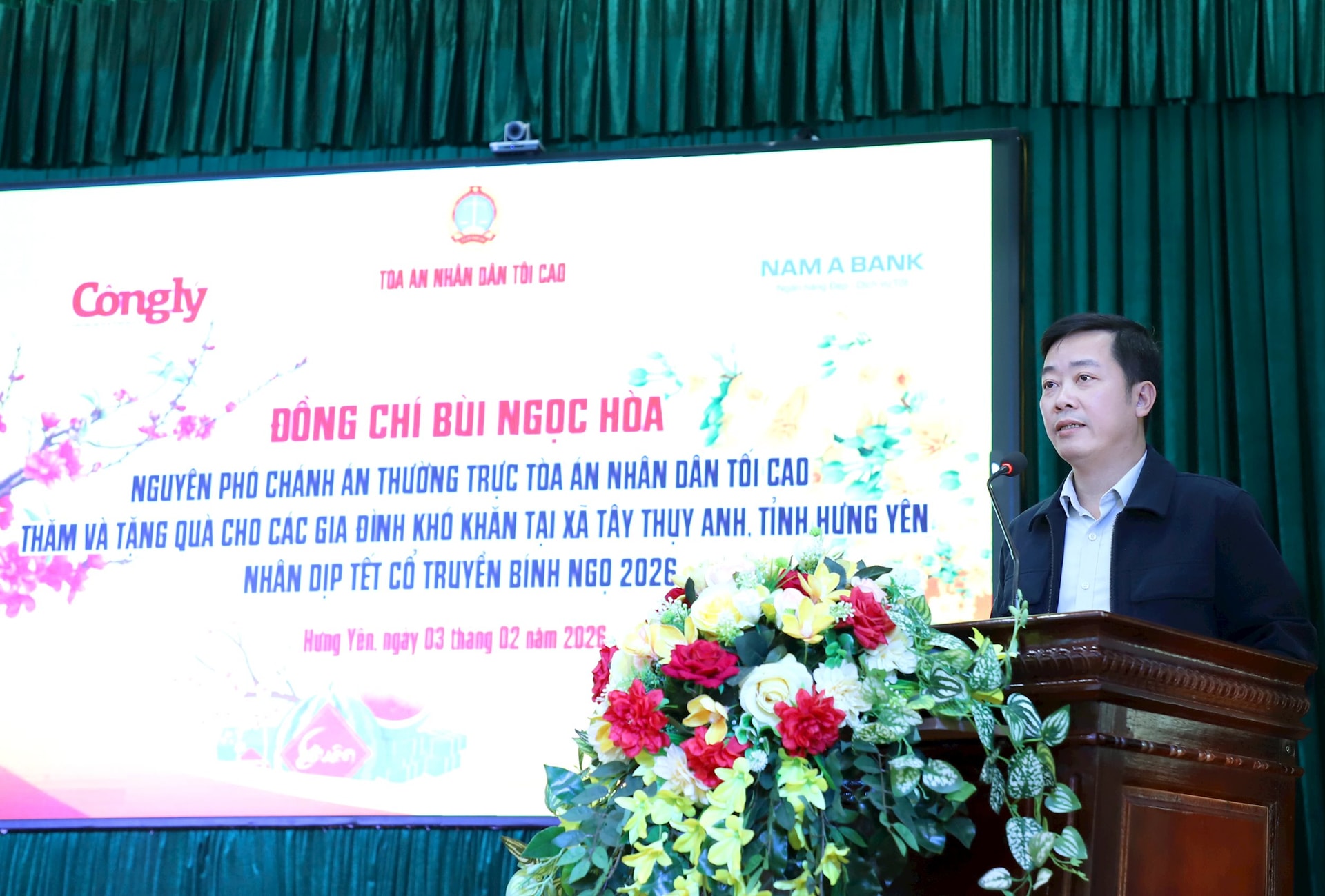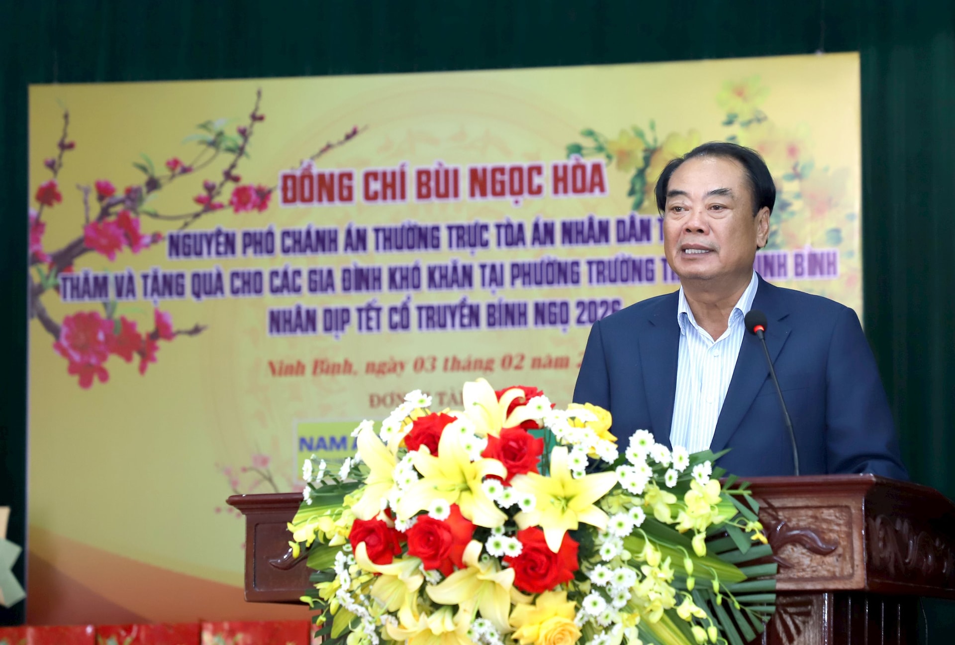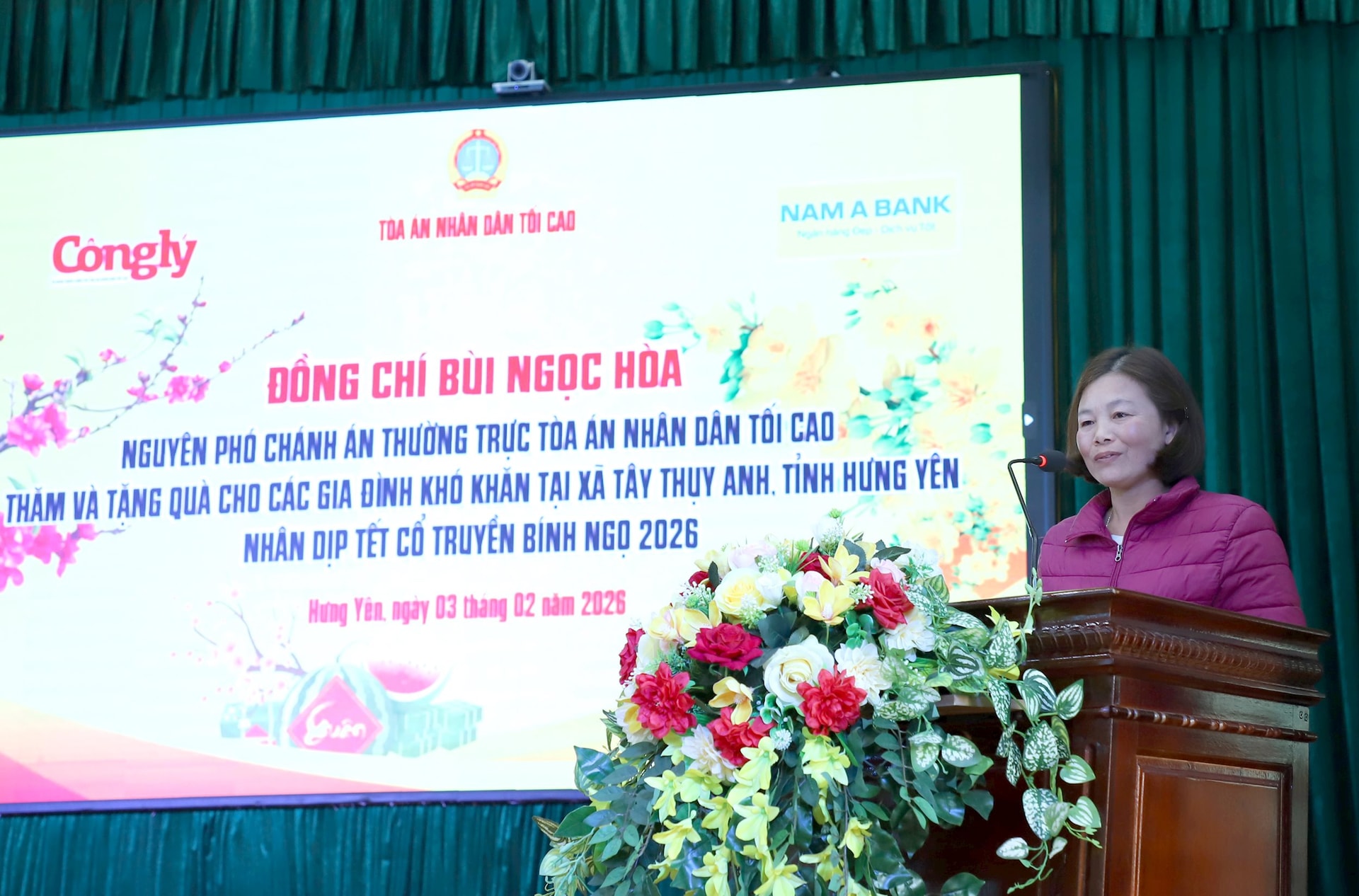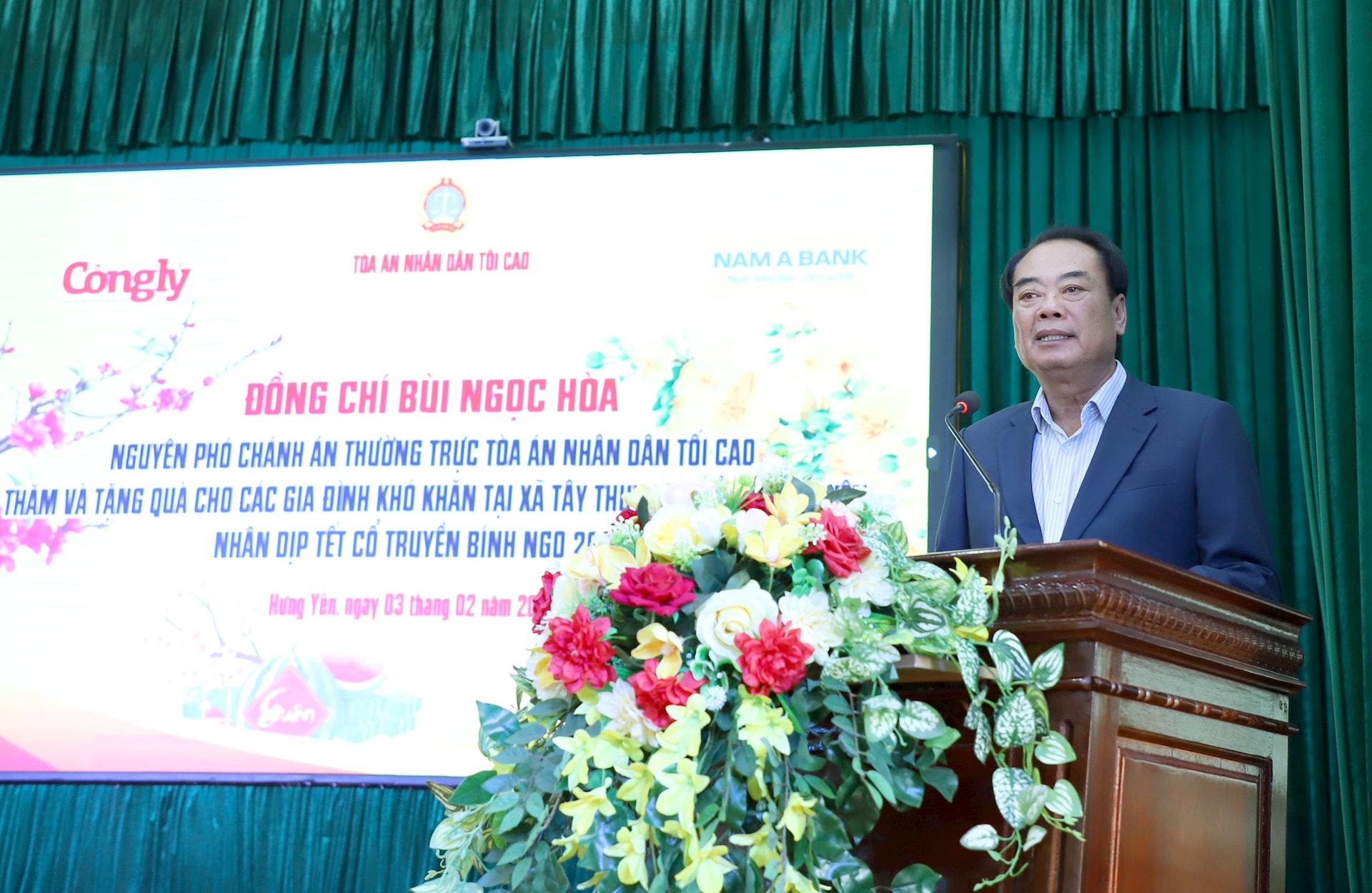 Phát biểu tại các nơi trao quà, ông Bùi Ngọc Hòa, nguyên Phó Chánh án Thường trực TANDTC cho biết, mỗi khi Tết đến Xuân về, trong không khí ấm áp của những ngày giáp Tết, chúng ta lại cùng nhau sum họp để chia sẻ yêu thương. Với truyền thống "Lá lành đùm lá rách" và trách nhiệm của người con quê hương, ông được đại diện, cùng với Báo Công lý và các nhà hảo tâm phối hợp cùng chính quyền địa phương huy động nguồn lực, kinh phí để trao quà Tết cho các hộ gia đình có hoàn cảnh khó khăn.