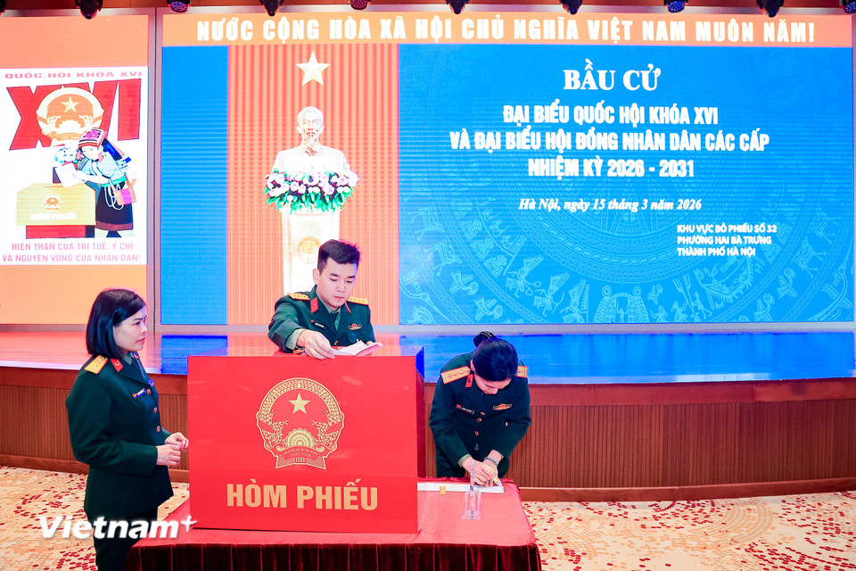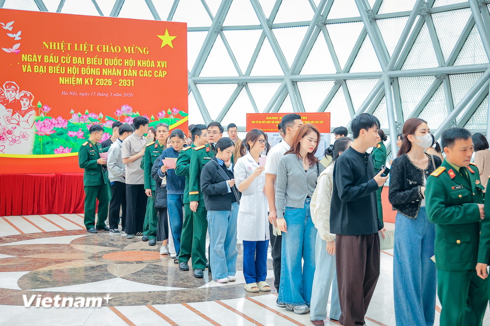 Cùng hòa chung không khí ngày hội cả nước, sáng 15/3, hơn 3.000 cử tri đã đi bỏ phiếu tại điểm bỏ phiếu bệnh viện Trung ương Quân đội 108. (Ảnh: Hoài Nam/Vietnam+)