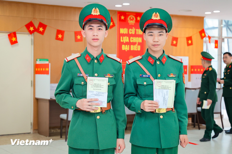 Thể hiện ý thức trách nhiệm, niềm tin và kỳ vọng của thế hệ trẻ đối với sự phát triển của đất nước, Hoàng Long và Văn Bình phấn khởi khi đây là lần đầu tiên tự tay bỏ lá phiếu bầu cử. (Ảnh: Hoài Nam/Vietnam+)