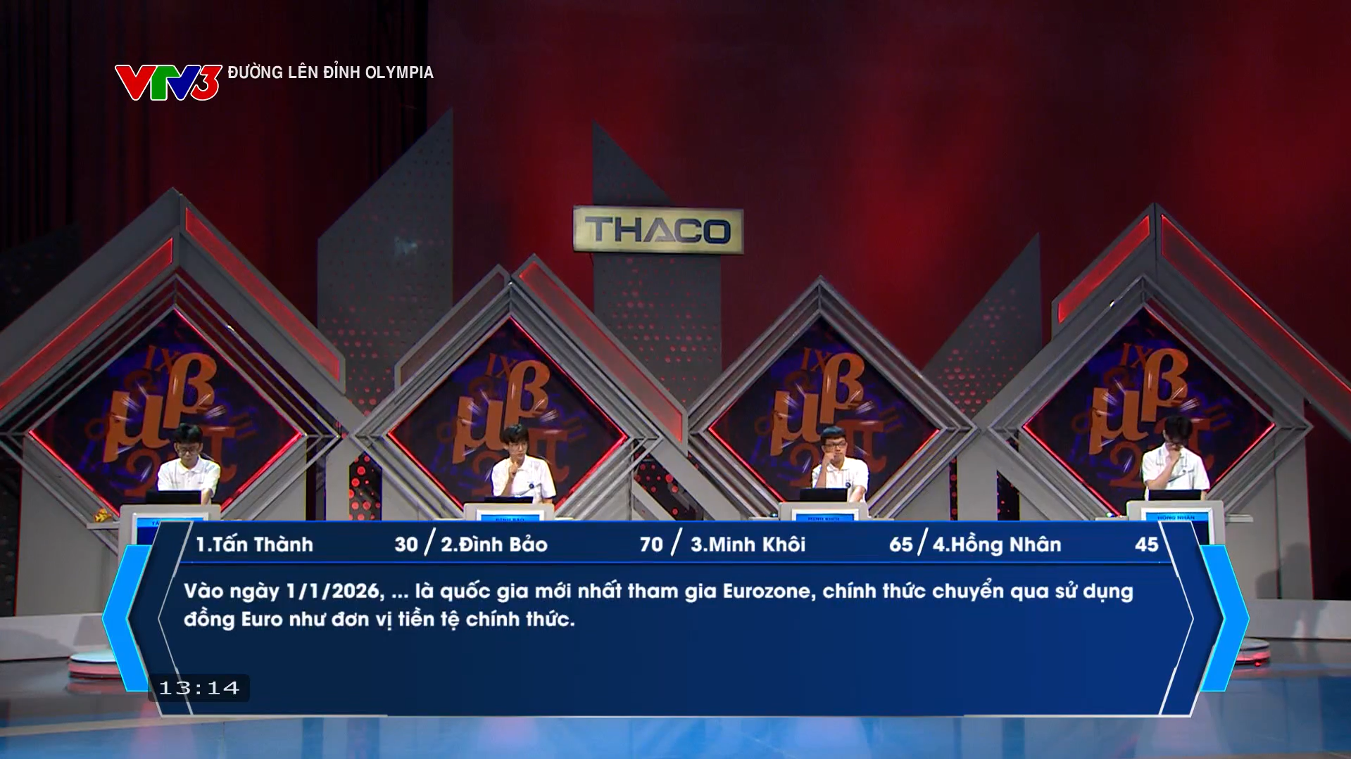 Cuộc thi Đường lên đỉnh Olympia tuần này chứng kiến màn tranh tài của 4 thí sinh: Nguyễn Đình Bảo (trường THPT Chuyên Lê Quý Đôn, Đà Nẵng), Nguyễn Hồng Nhân (trường THPT Mê Linh, Hà Nội), Nguyễn Sư Minh Khôi (trường THPT Đông Hà, Quảng Trị) và Vũ Tấn Thành (trường THPT Chuyên Hưng Yên, Hưng Yên).
