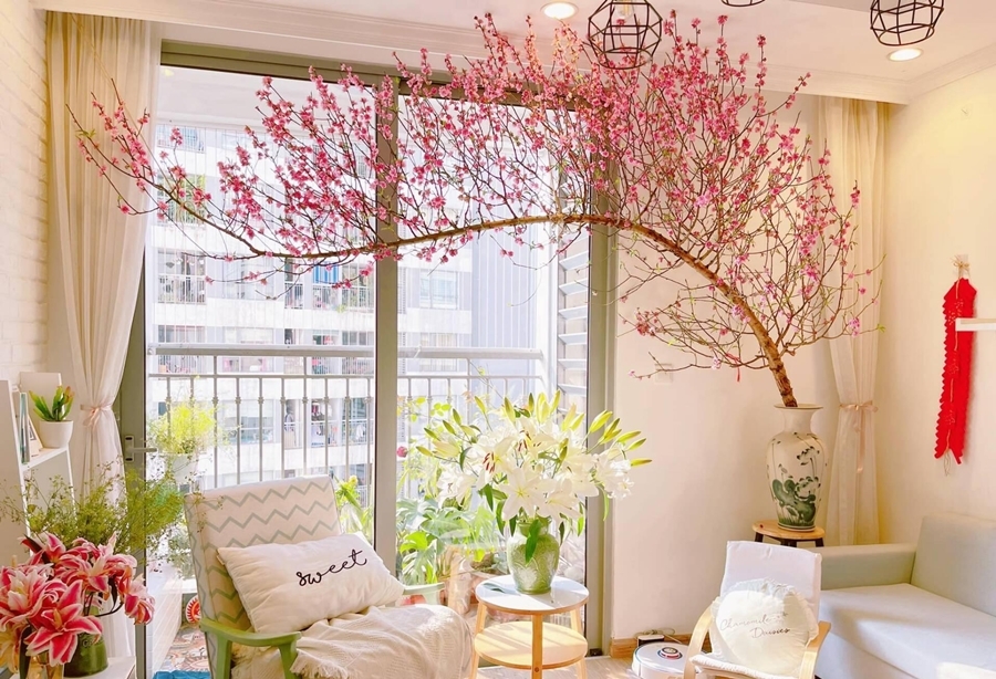 Chẳng hạn, phòng khách có thể đặt một chậu mai, đào mini cao khoảng 1–1,2m hoặc một bình hoa tươi đặt trên bàn trà. Nếu diện tích hạn chế hơn, chỉ cần một cành đào, cành mận hoặc bình lay ơn, cúc vàng cũng đủ tạo dấu ấn mùa xuân.