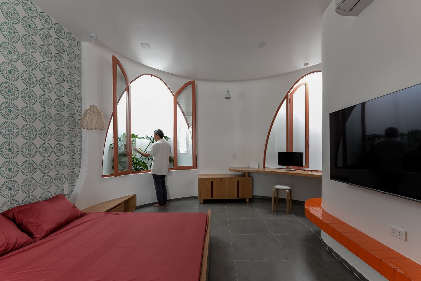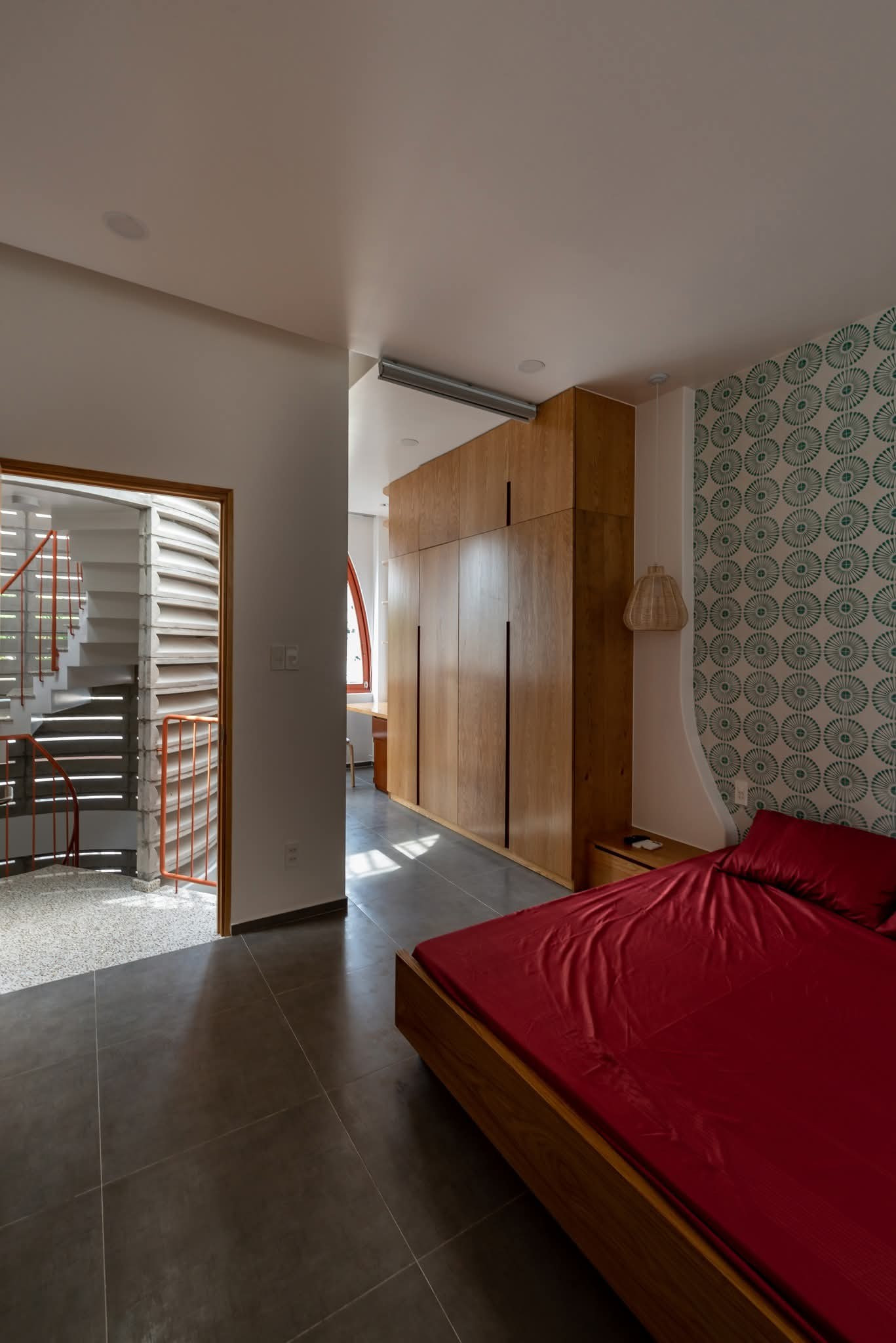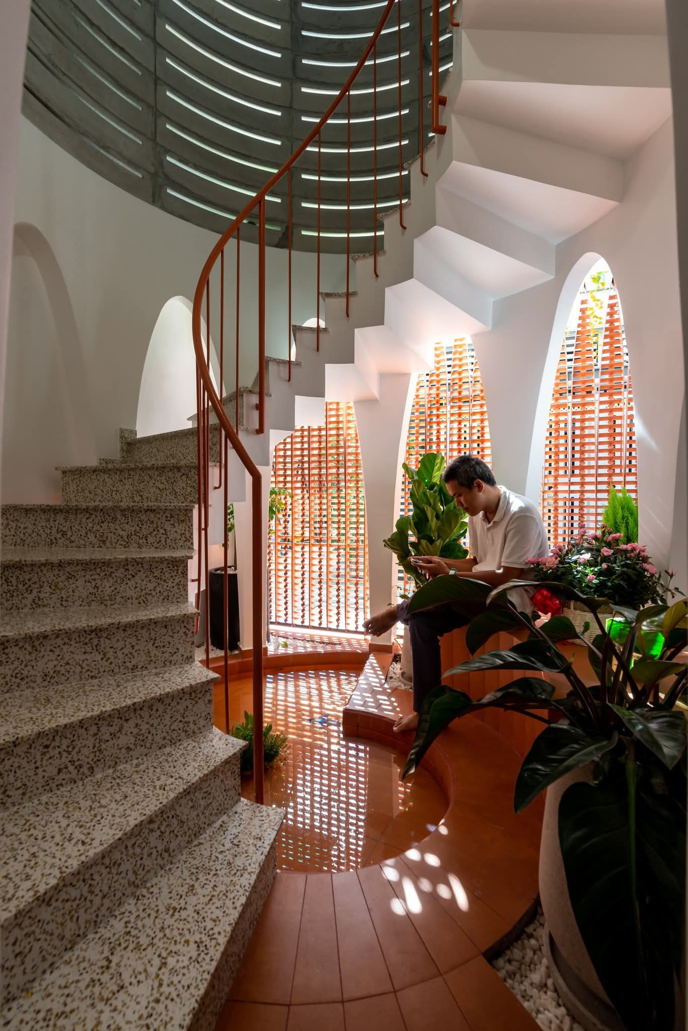Các phòng sử dụng được bố trí vệ tinh quanh trục cầu thang, nhận đủ ánh sáng tự nhiên và không khí thông thoáng mát mẻ.