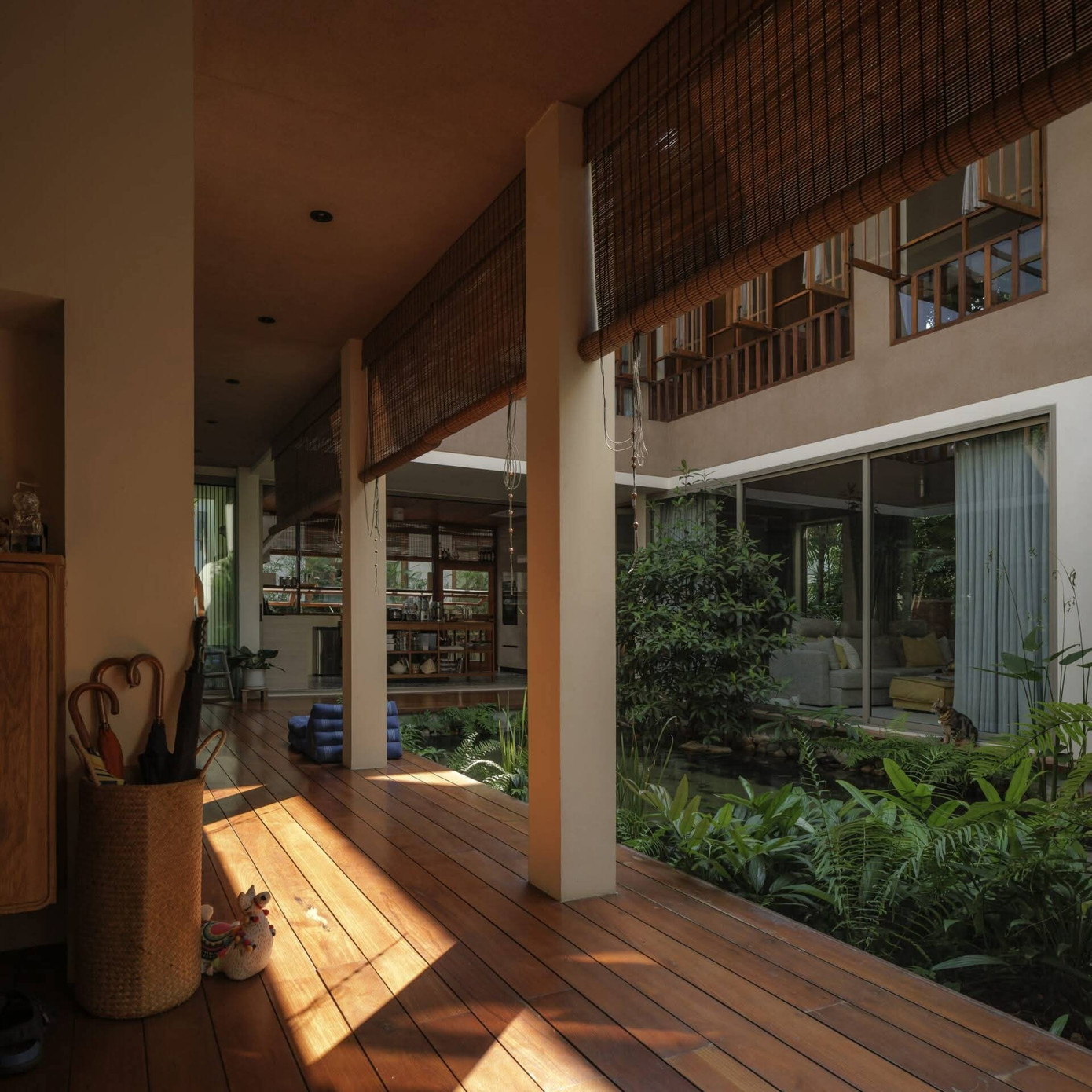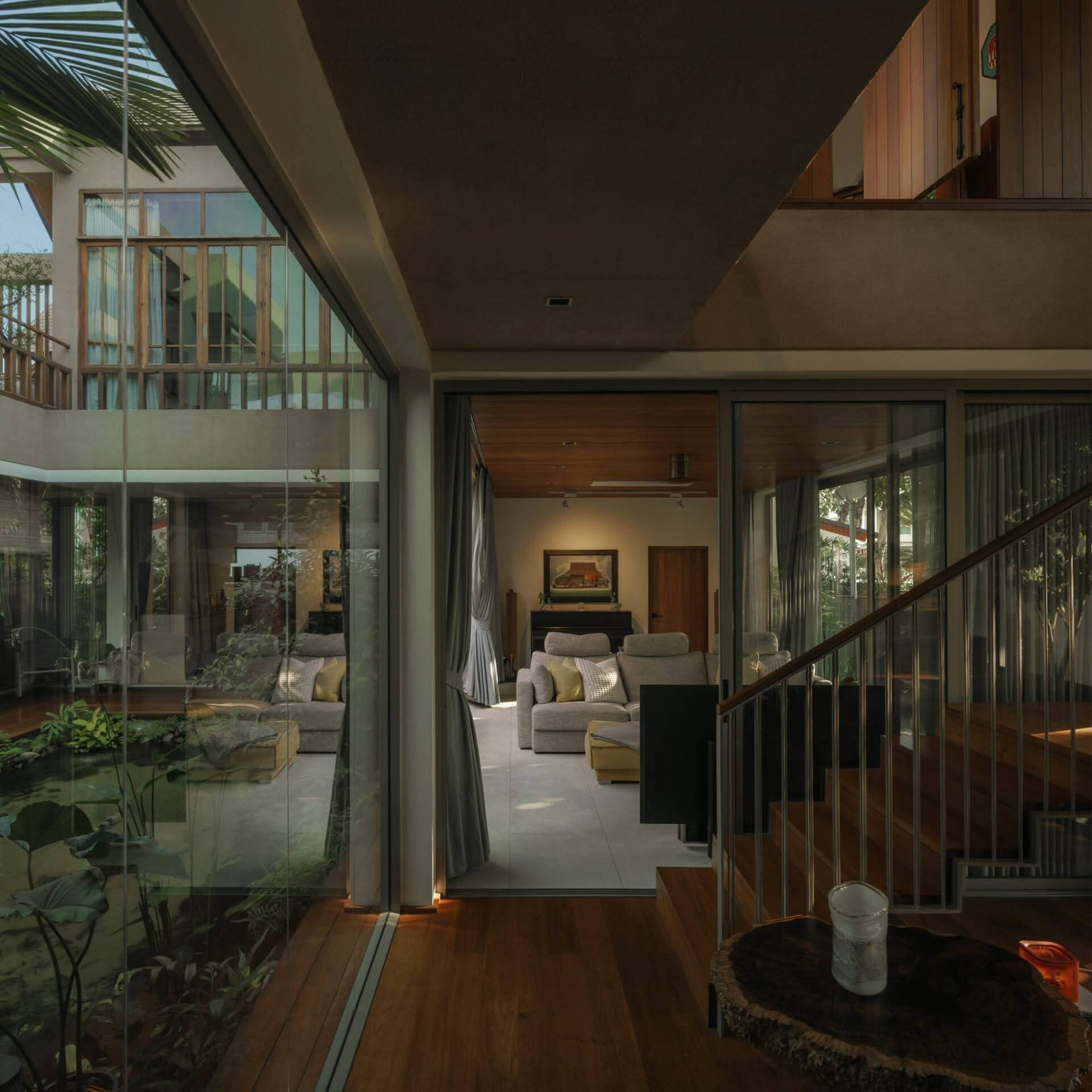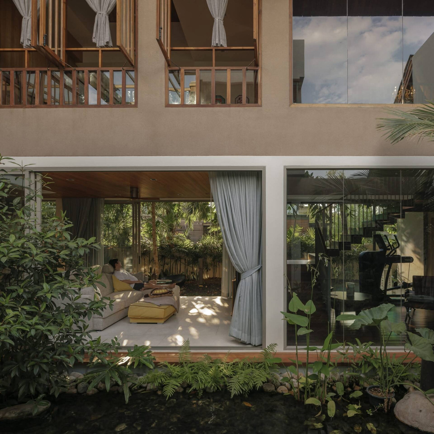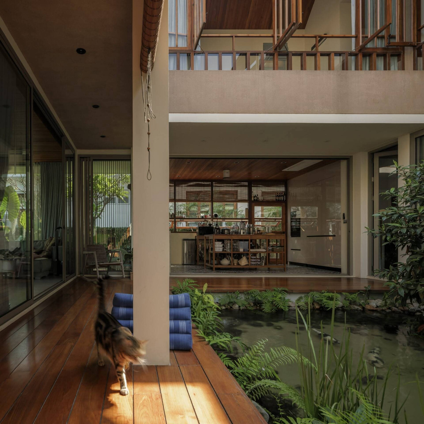 Tổ chức xung quanh một hồ nước ở giữa, ngôi nhà không chỉ trở nên thông thoáng, tiện nghi mà còn tạo nên những góc nhìn thư thái dễ chịu, phù hợp với nhu cầu sinh hoạt lâu dài của gia đình.