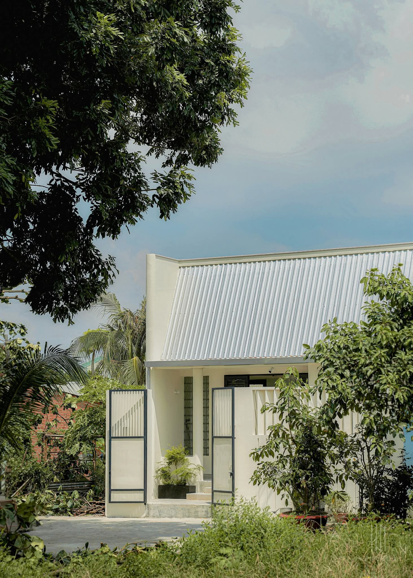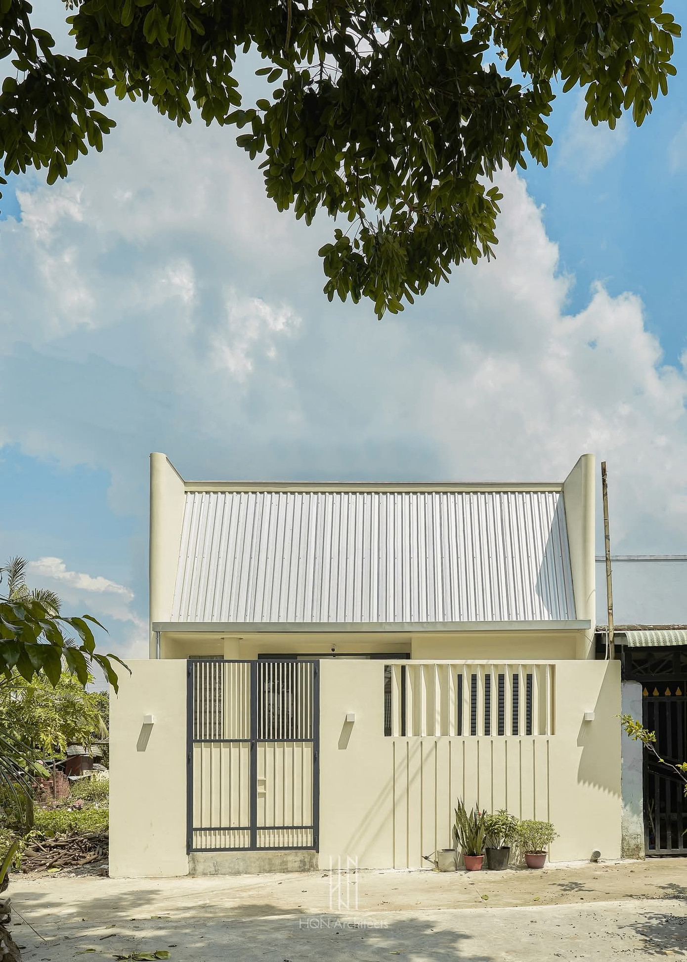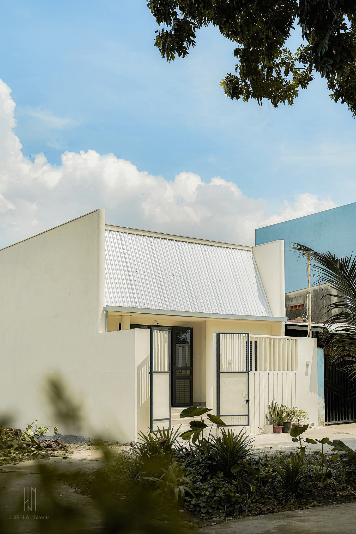 Mặt tiền ngôi nhà đơn giản nhưng thu hút với phần mái thú vị, hệ lam tường bao đồng nhất với cổng cùng màu sắc trắng kem nhã nhặn.