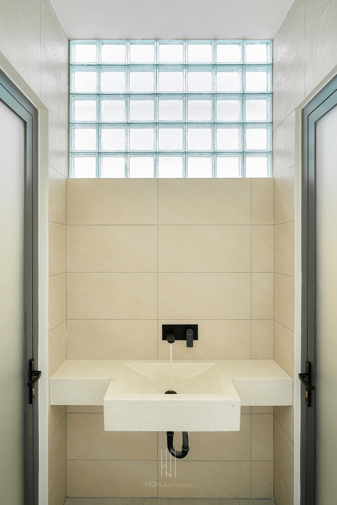 Ngôi nhà được thiết kế theo phong cách tối giản, với các tông màu kem, nâu nhạt và xanh lá. Điểm đặc biệt nằm ở khe sáng dọc nhà dài 12 m, giúp không gian sinh hoạt chung và lối đi xuyên suốt, luôn đủ sáng.