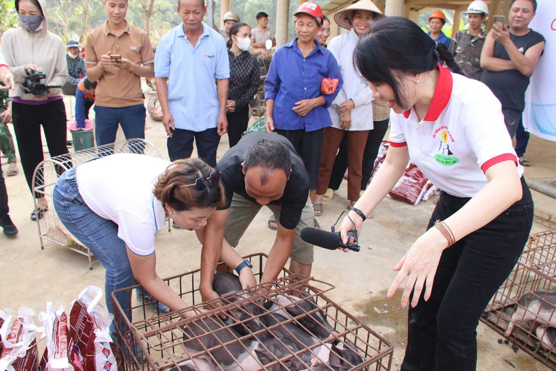 Thu âm thanh chương trình tặng heo giống cho bà con vùng lũ.