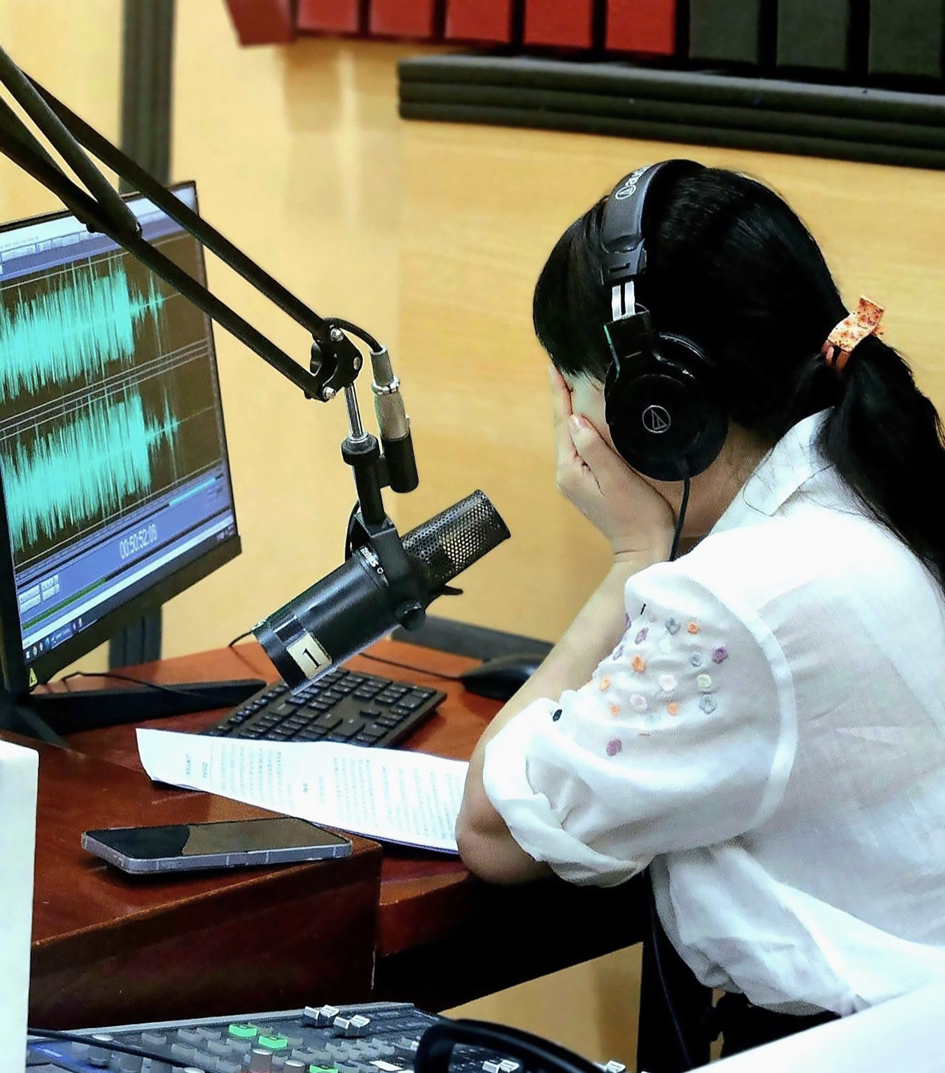 Giây phút nghẹn ngào của nhà báo Hồng Thúy khi thu âm chương trình.