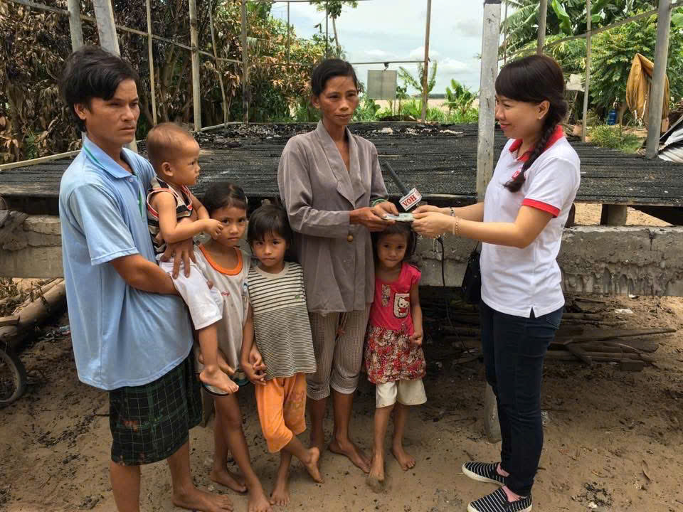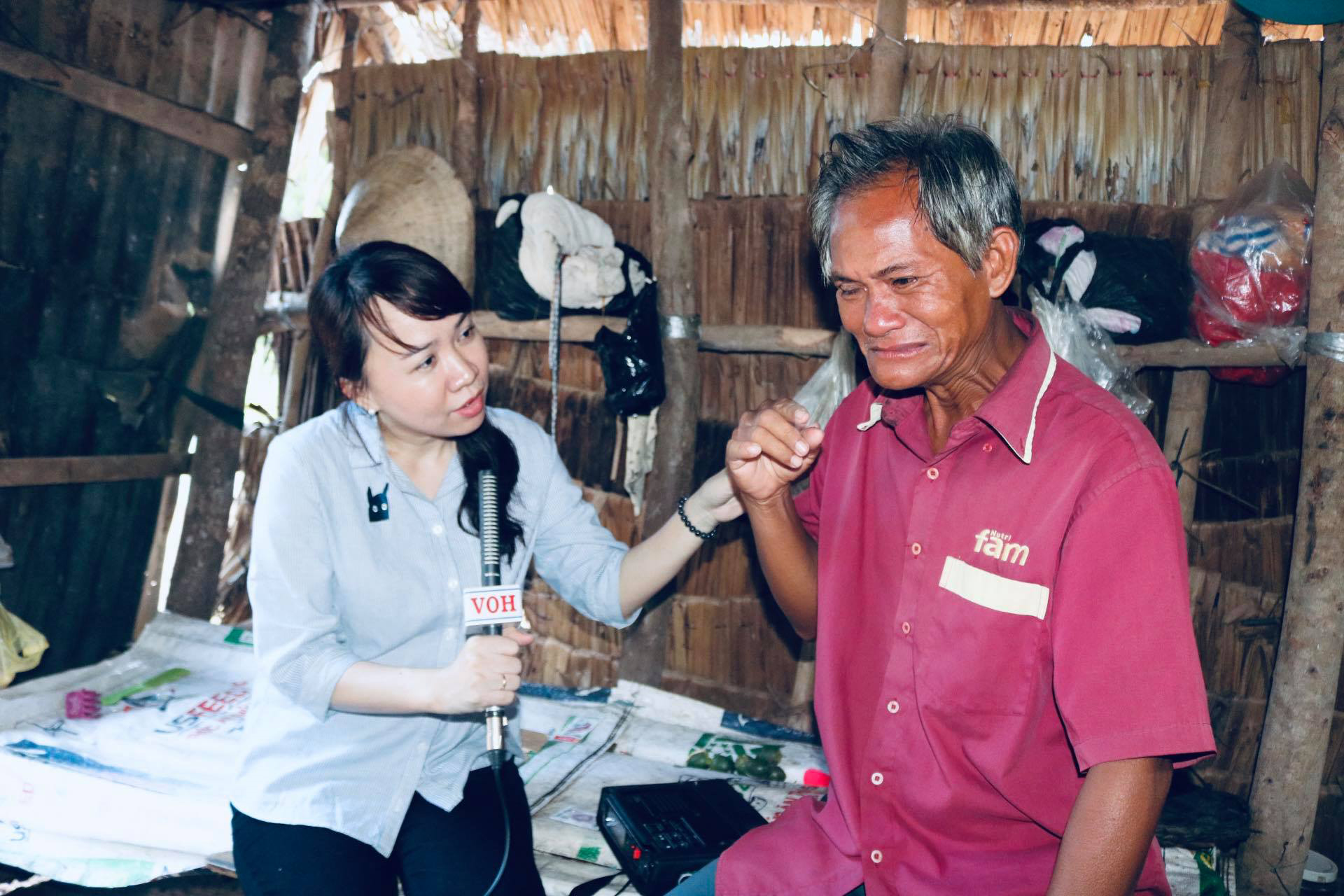 Nhà báo Hồng Thúy trao quà của thính giả đến một gia đình không may bị hỏa hoạn.
