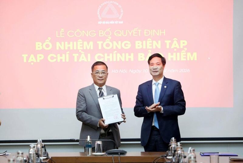 Ông Nguyễn Xuân Việt, Chủ tịch Hiệp hội Bảo hiểm Việt Nam trao quyết định bổ nhiệm cho nhà báo Nguyễn Phong Cầm. Ảnh: Tuấn Minh