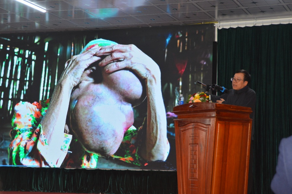 Nhà báo Đỗ Doãn Hoàng trình bày tham luận tại hội nghị với bức ảnh về một nhân vật trong tác phẩm báo chí của anh.