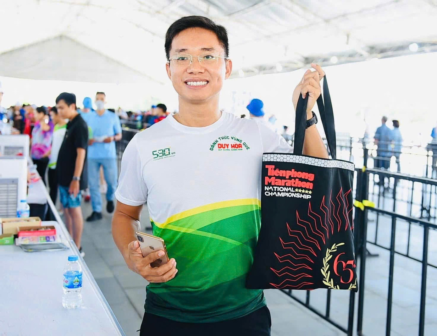Nhà báo - runner Ngô Công Quang nhận racekit tại Giải Vô địch Quốc gia Marathon và cự ly dài báo Tiền Phong ở Phú Yên.
