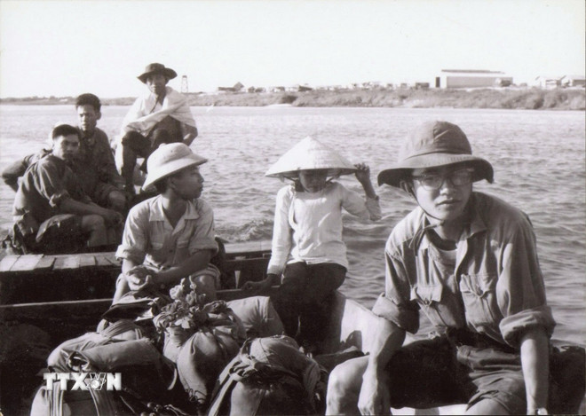 Nhà báo Trương Đức Anh (ngoài cùng bên phải) vượt sông Thạch Hãn cùng bộ đội vào giải phóng Quảng Trị năm 1972. (Ảnh: TTXVN)