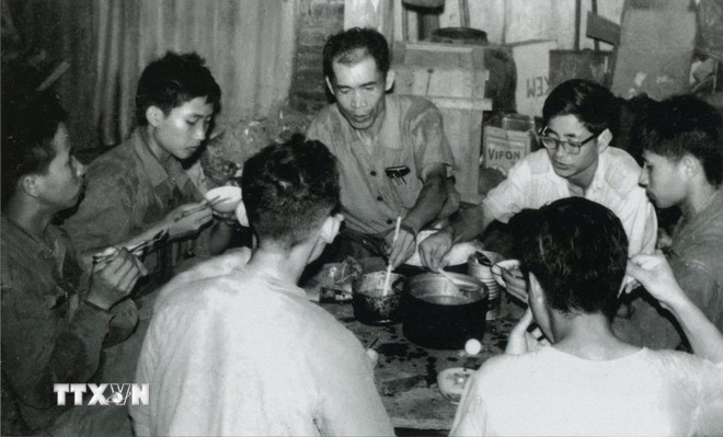 Nhà báo Trương Đức Anh (đeo kính) trong bữa cơm với các đồng nghiệp tại chiến trường Quảng Trị, năm 1972. (Ảnh: TTXVN)