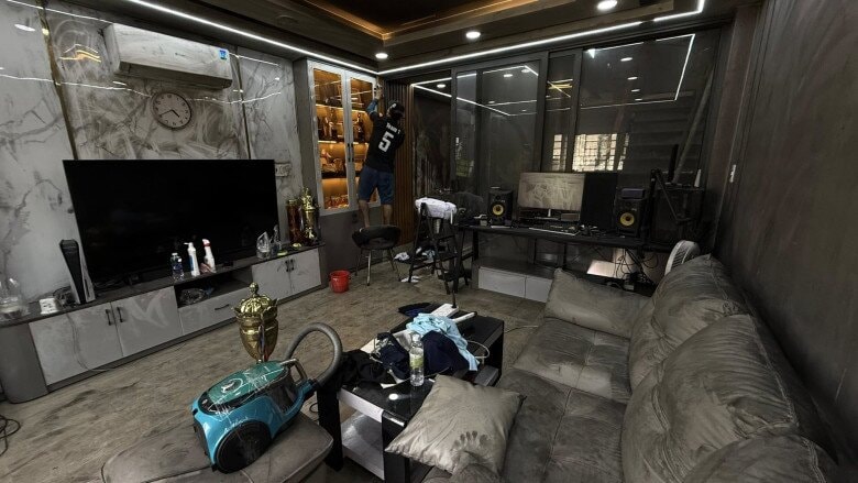 Cảnh tro bụi bám đen nội thất nhà Phạm Trưởng sau vụ cháy.