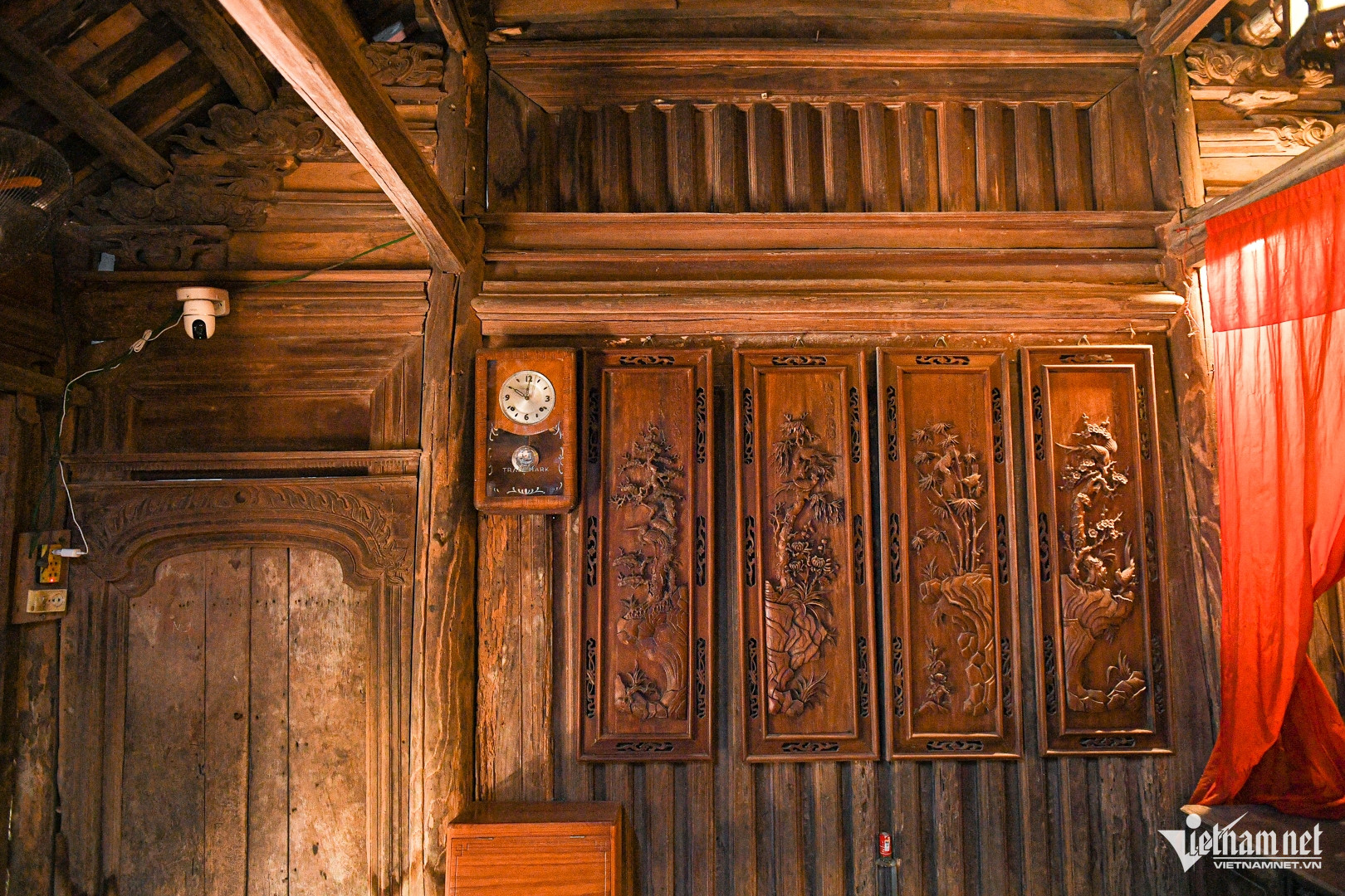 Hệ thống cửa chính ngôi nhà được thiết kế để tháo ra, vào dễ dàng. Ông Hùng cho biết, các cụ thời xưa thiết kế như vậy để phòng khi nhà có việc lớn (cỗ tiệc hiếu, hỉ, giỗ, khao thọ…) thì có thể tháo cửa ra, đặt xuống đất thay chiếu và tạo cảm giác thông thoáng trong nhà.