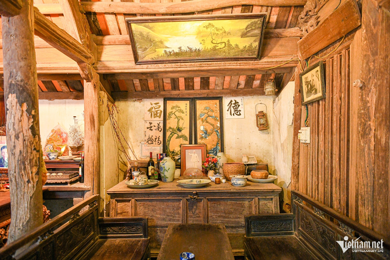 Bên trong căn nhà bài trí nhiều đồ cổ có giá trị về mặt văn hóa, niên đại như: bình sứ, bát sứ, mâm đồng 3 chân...