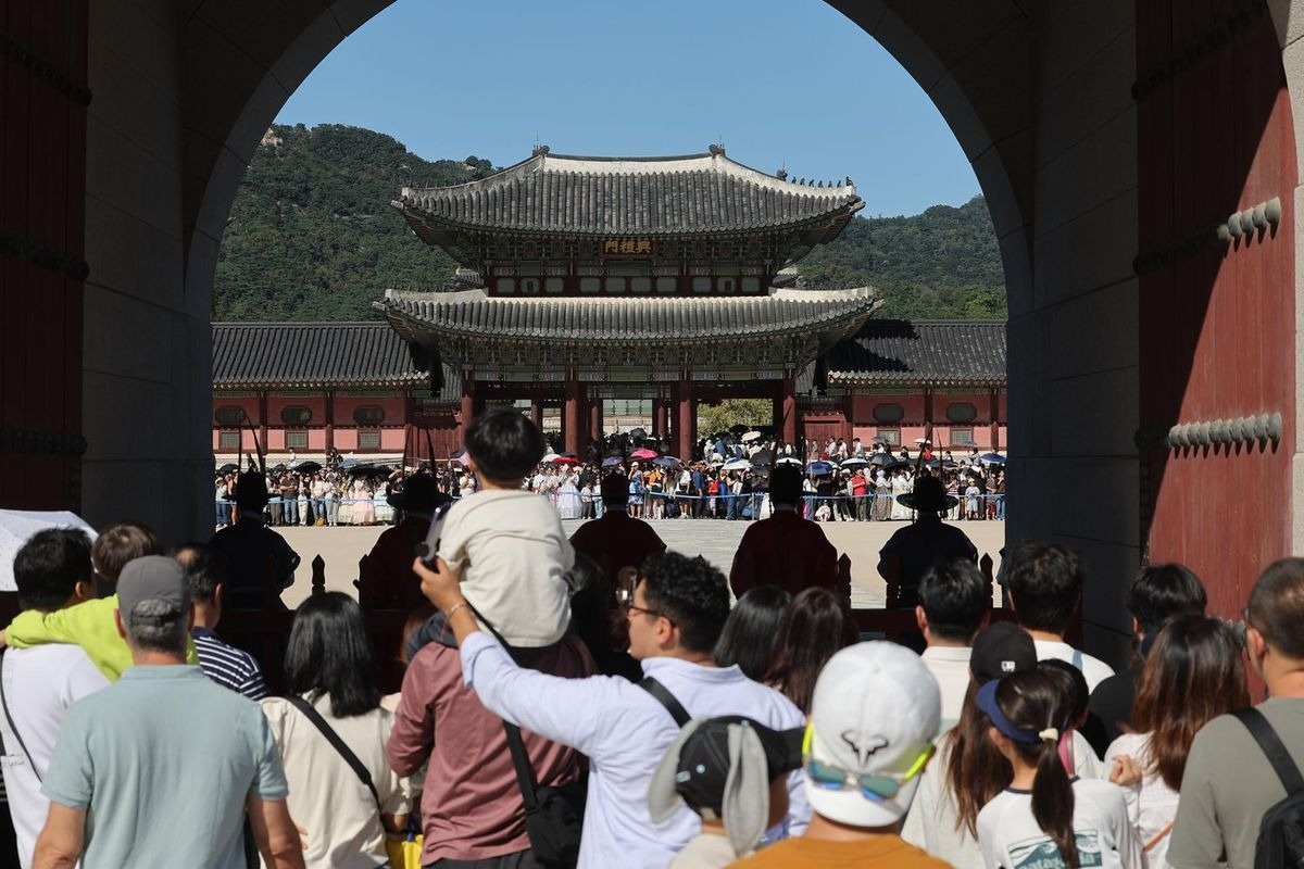 Khách du lịch trong nước và quốc tế xếp hàng vào Cung điện Gyeongbok ở trung tâm Seoul, Hàn Quốc. Ảnh: Yonhap.