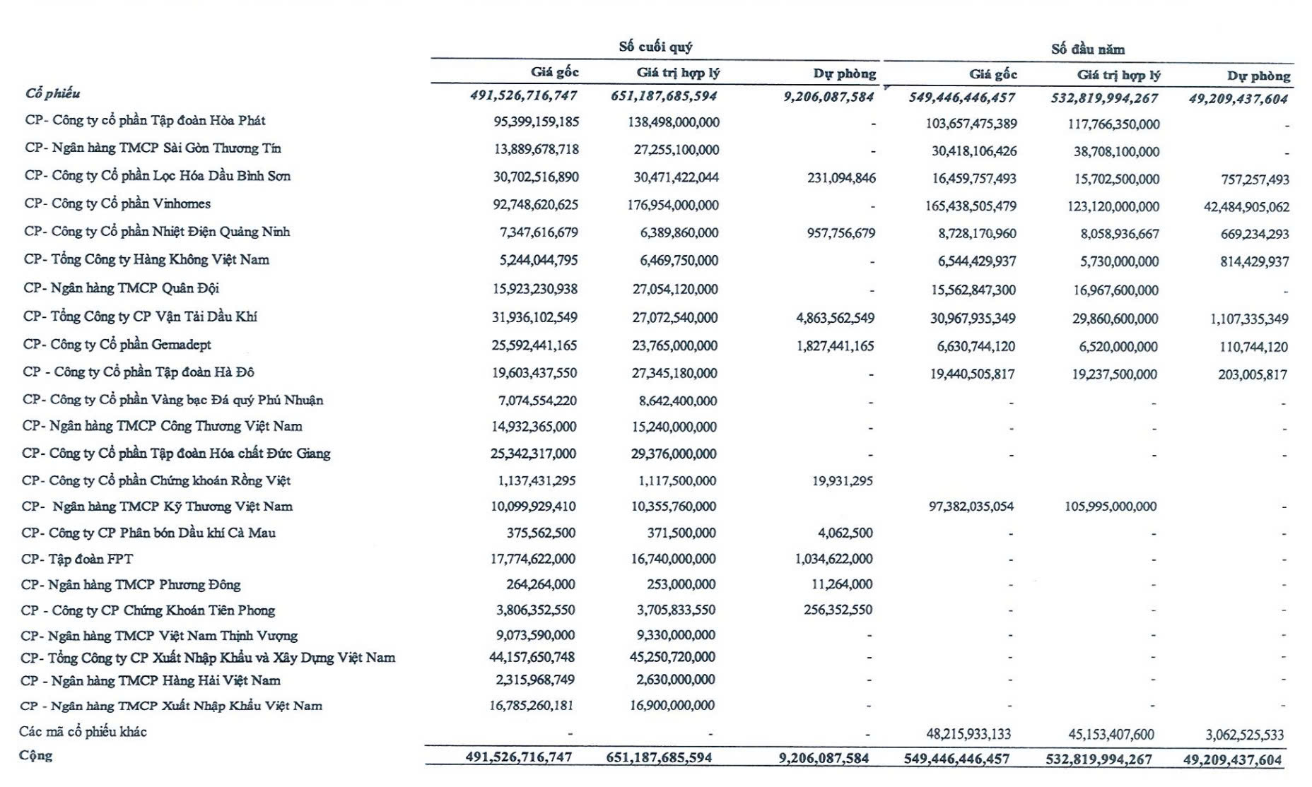 Trong kỳ, khoản mục đầu tư chứng khoán giảm 10,5% so với đầu năm, tương ứng giảm 57,92 tỷ đồng, về 491,53 tỷ đồng và bằng 37,6% tổng tài sản. Trong đó, nếu như đầu năm trích lập dự phòng giảm giá chứng khoán hơn 49,2 tỷ đồng thì tới cuối kỳ chỉ còn trích lập hơn 9,21 tỷ đồng, tương ứng hoàn nhập dự phòng đầu tư chứng khoán.