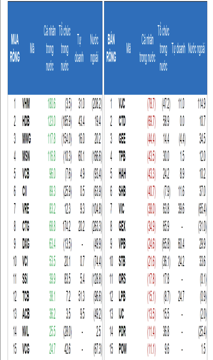 Nhà đầu tư cá nhân mua ròng 1159.5 tỷ đồng, trong đó họ mua ròng khớp lệnh là 865.1 tỷ đồng. Tính riêng giao dịch khớp lệnh, họ mua ròng 11/18 ngành, chủ yếu là ngành Bất động sản. Top mua ròng của nhà đầu tư cá nhân tập trung gồm: VHM, HDB, MWG, MSN, VCB, CII, VRE, CTG, DXG, VCI.