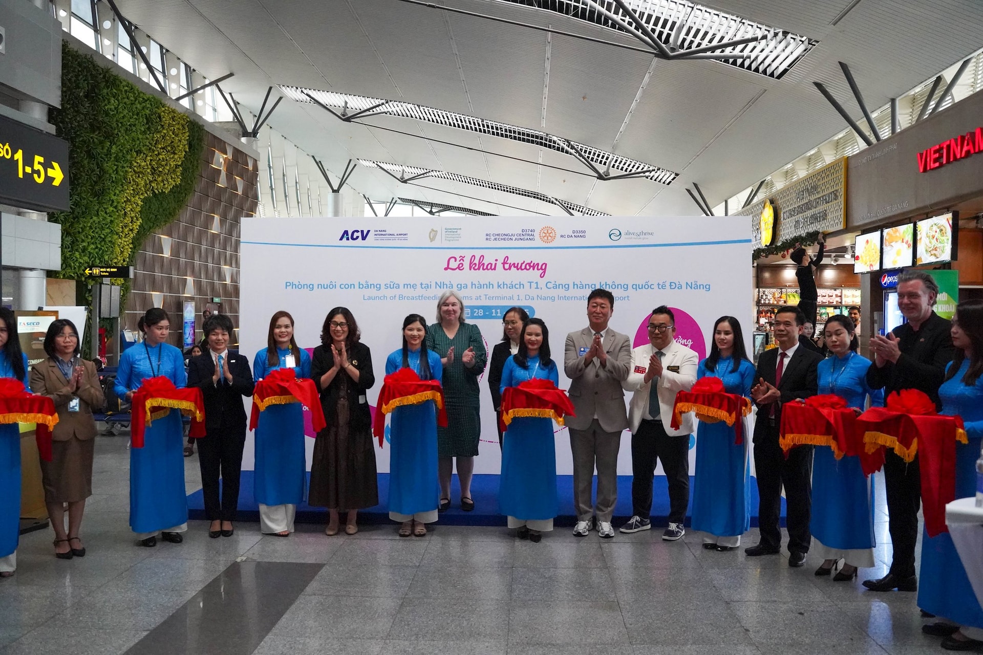 Các đại biểu cắt băng khai trương 2 phòng nuôi con bằng sữa mẹ tại Nhà ga hành khách T1, Cảng hàng không quốc tế Đà Nẵng.