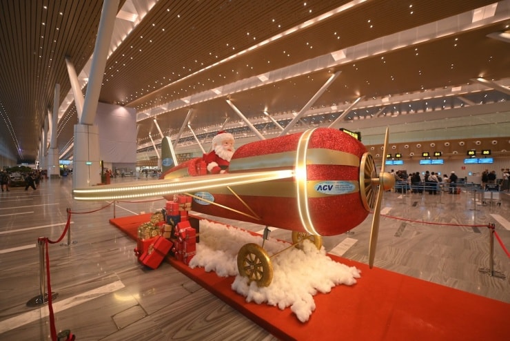 Điểm nhấn thú vị tại các cổng vào là những cột chữ Y được quấn nhung đỏ, gợi liên tưởng đến những que kẹo ngọt ngào. Bên cạnh đó là dây thông xanh, ngôi sao Noel và đàn hươu phát sáng. Đặc biệt, hình ảnh ông già Noel trong vai phi công cùng máy bay chở đầy quà tặng mang đến một câu chuyện Giáng sinh rất riêng của ngành hàng không.