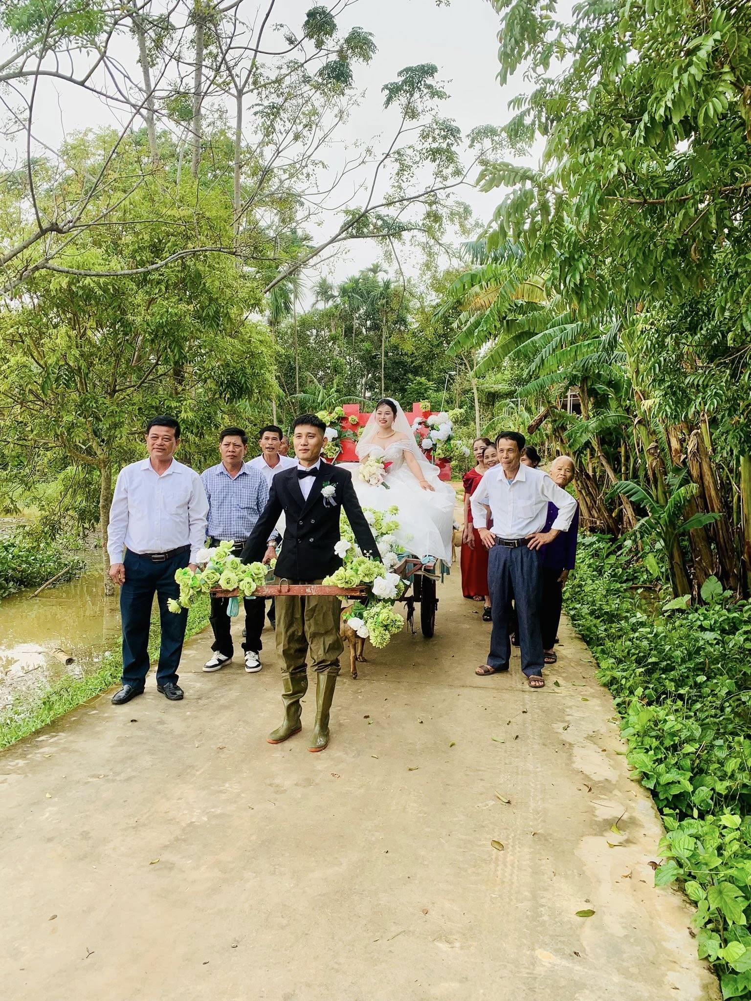 Trong ngày vui, cảnh tượng chú rể thân trên mặt vest, cài hoa, bên dưới mặc quần mưa đi ủng, kéo cô dâu bằng chiếc xe bò khiến nhiều quan khách thích thú, bật cười và trở thành kỷ niệm khó quên cho cặp vợ chồng mới cưới.