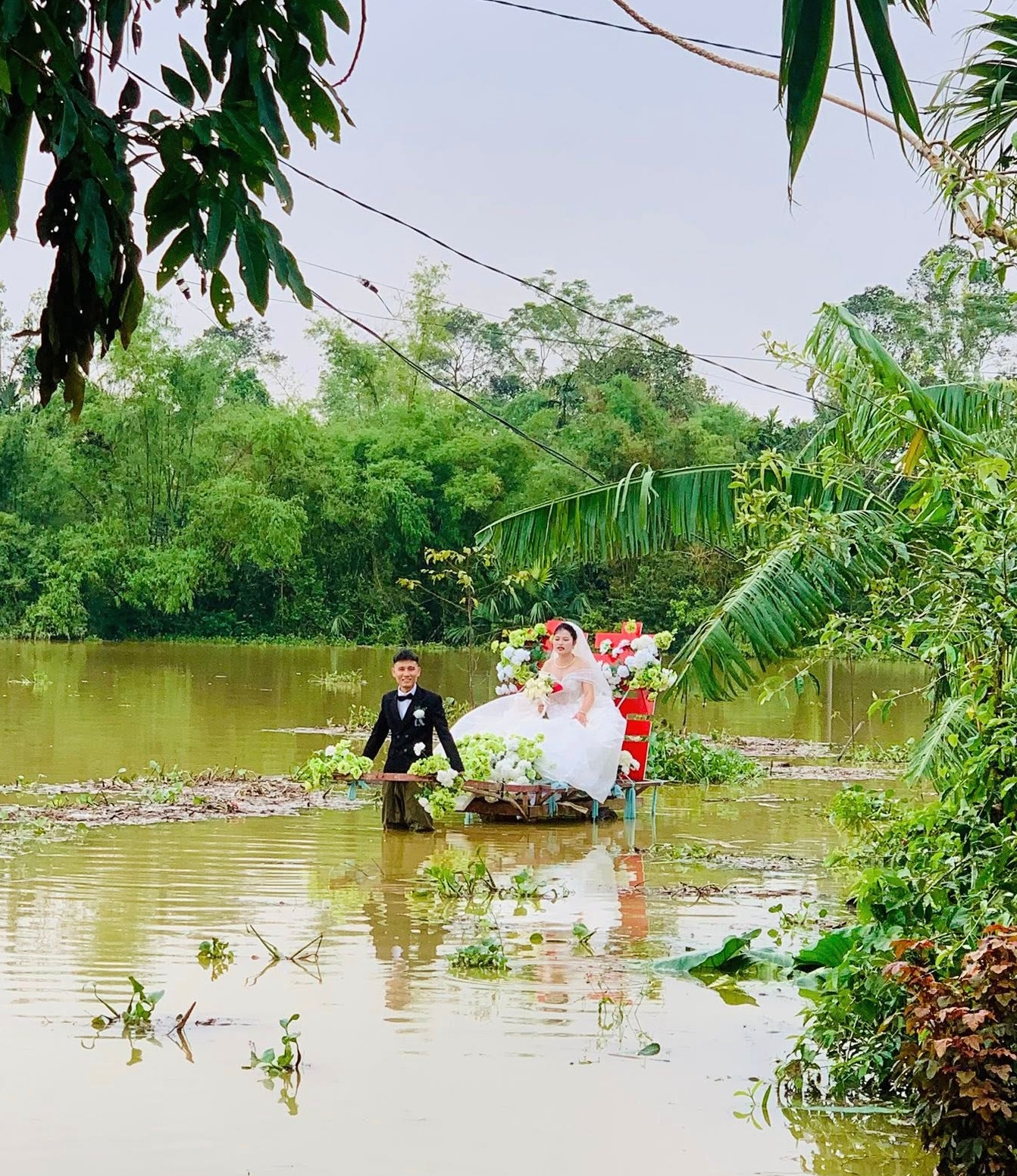Đám cưới ngày mưa lụt khiến đôi trẻ có kỷ niệm nhớ đời.